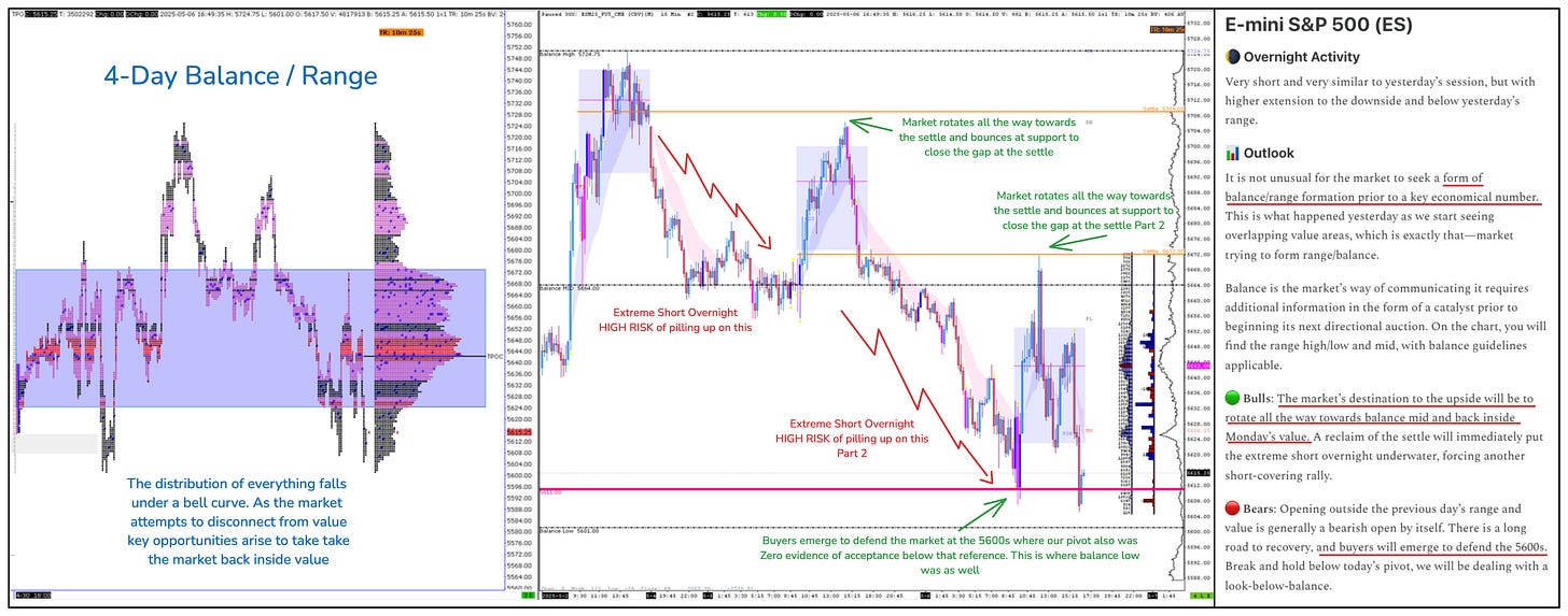 Quite literally, all the market did was bounce from support at our pivot at the U.S. open and get pulled back toward the midpoint of balance to close the gap at the settle reference to the tick. This was literally the same thing that happened on Monday.