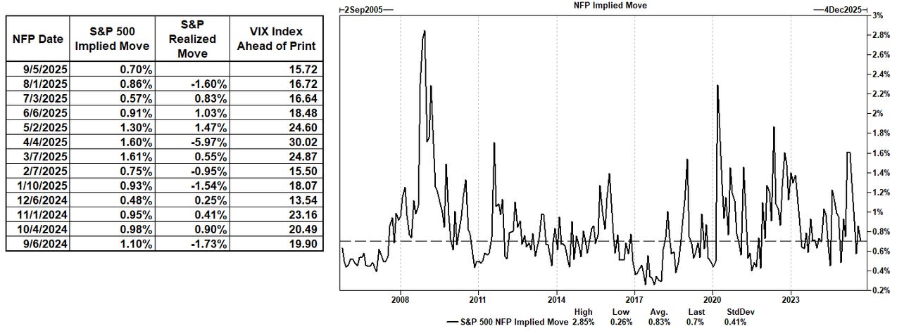 The option straddle is pricing in a 0.70% move tomorrow, which would be one of the lowest NFP day moves if it materializes. Notably, the last time the VIX was lower ahead of the NFP print was in February 25.