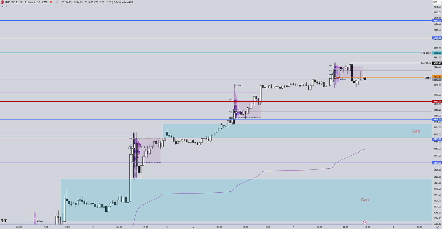This has left a poor high towards 5226 that we want to see excess above. While this is a single data point to note, the important thing is that we yet again build value higher.
