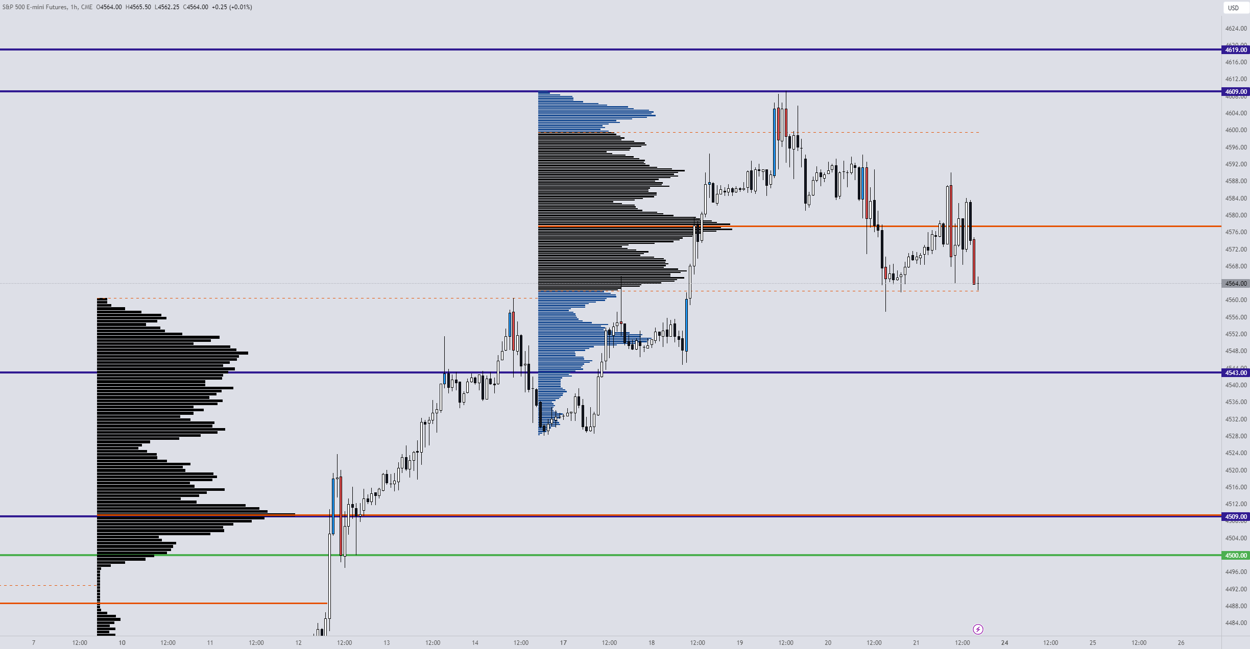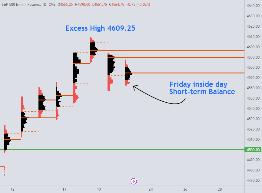 A downside breakout below Thursday’s low 4557 with further lower price acceptance significantly increases the importance of Wednesday’s excess high and confirms at least a short-term Trend to the downside.