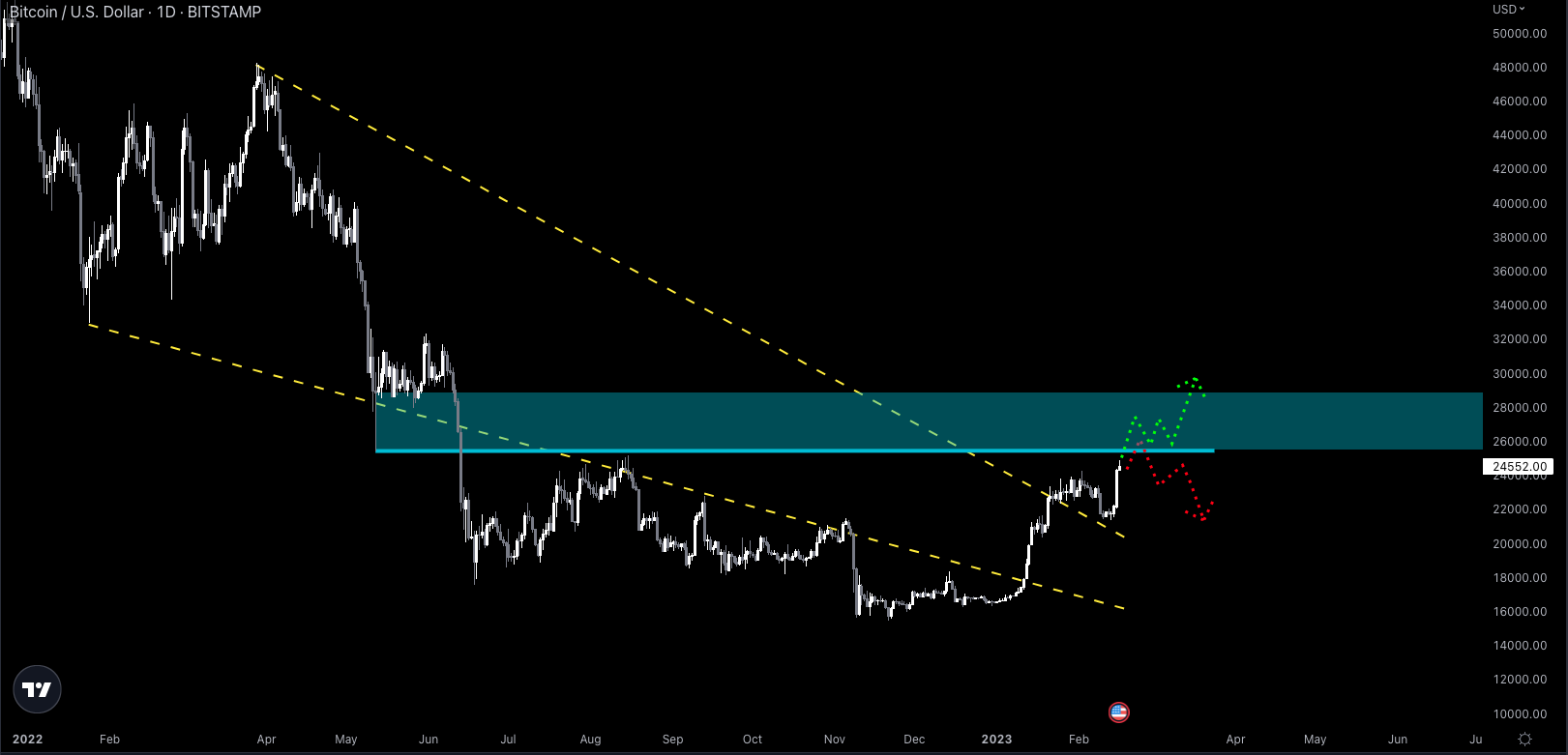 If Bitcoin can flip AND hold/consolidate above $25K, the bullish move up towards $28-30K (blue shaded rectangle) becomes very strong.