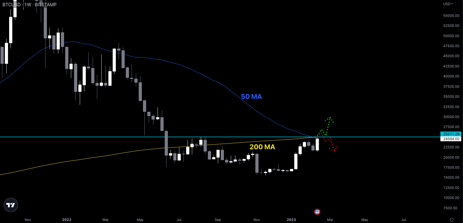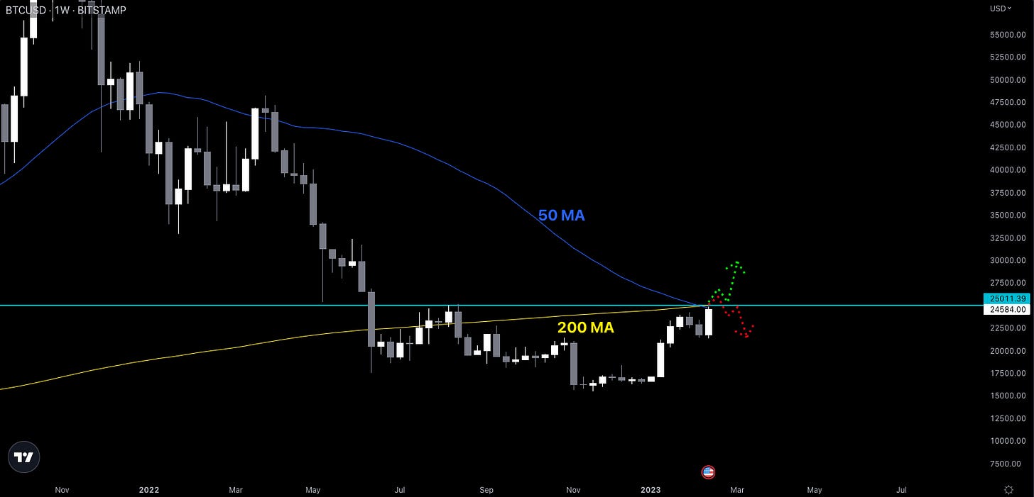 If we get a weekly candle, or multiple weekly candles ABOVE the blue $25K level, that bullish case becomes that much stronger.