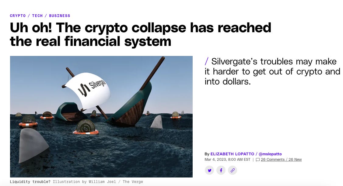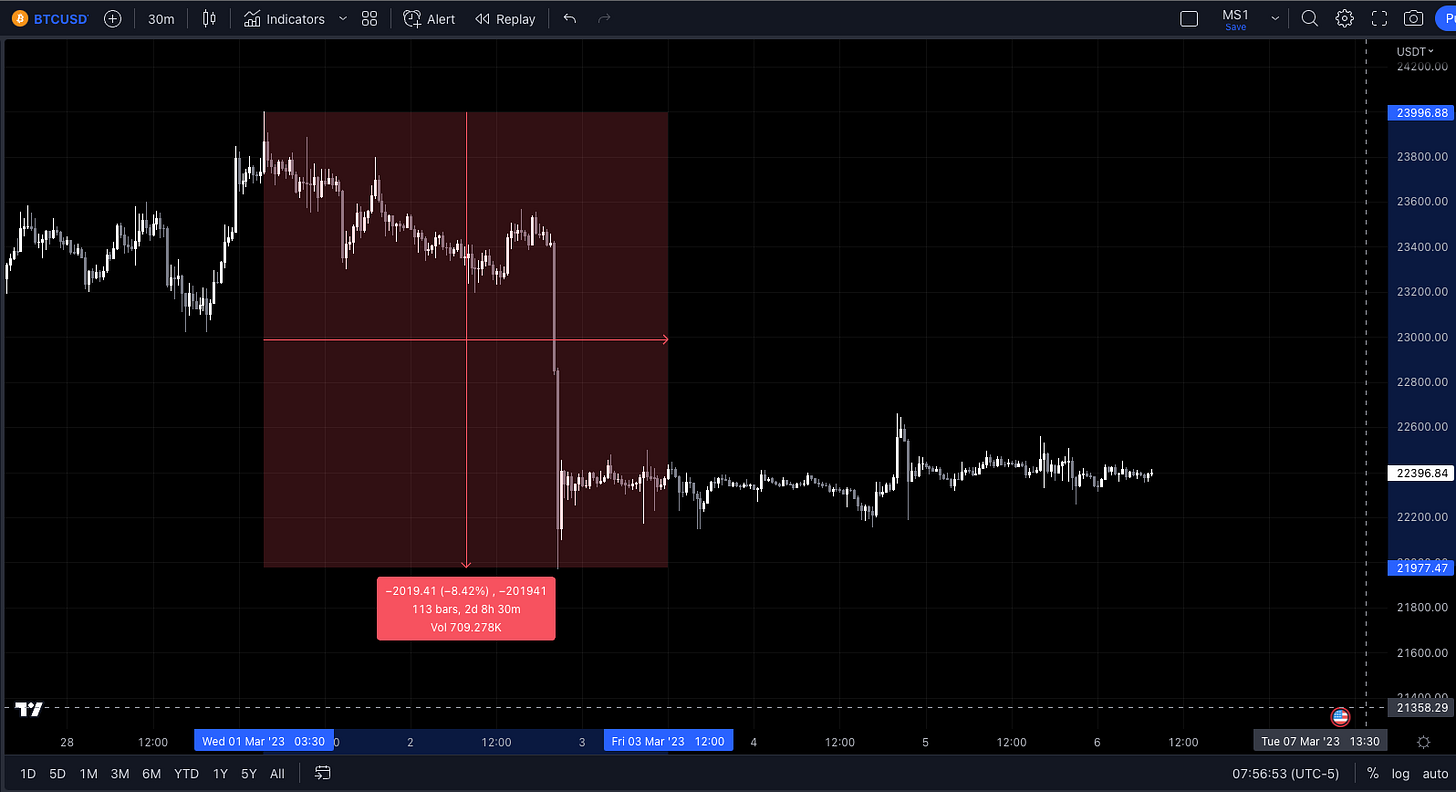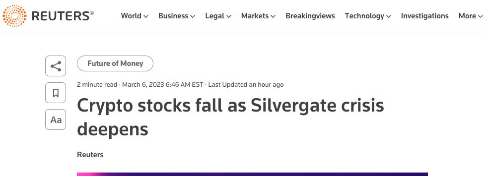 If you’re not aware, cause for this recent leg down was due to concerns at Silvergate Bank, which if you don’t know is basically an on-ramp bank for institutions to gain exposure to crypto.