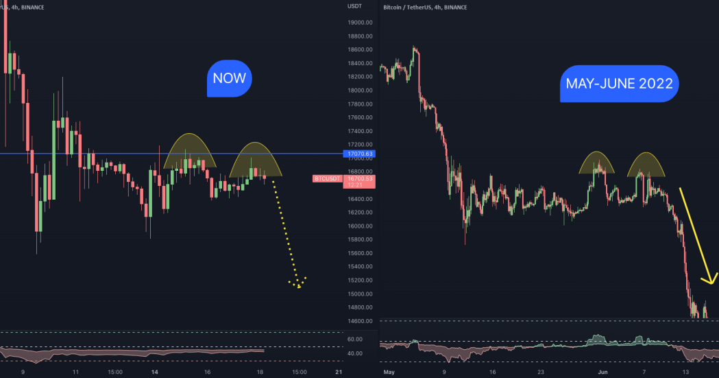 We can see that the two charts are eerily similar. We've experience a double top at the 16800-17100 resistance.