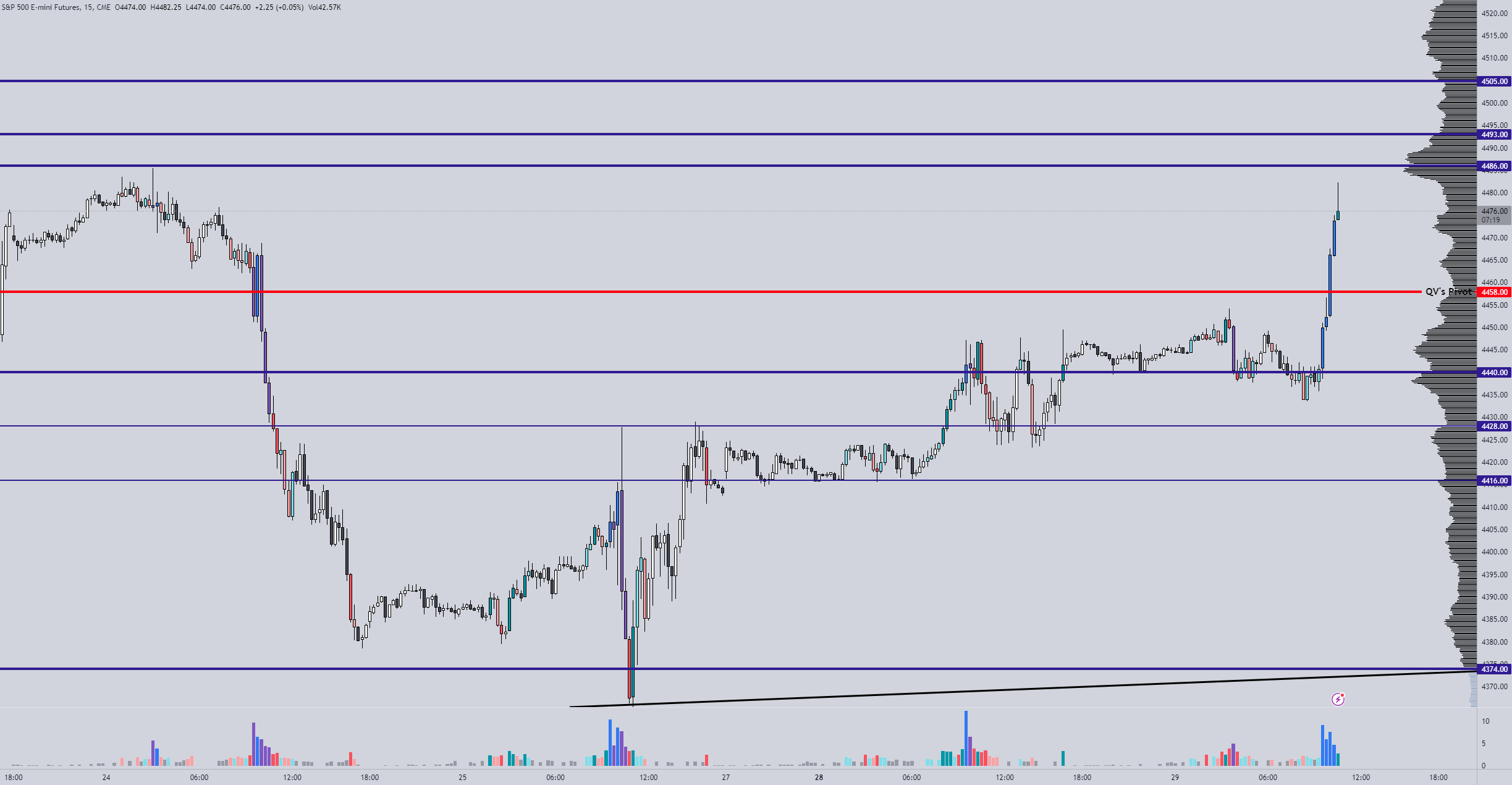 The NY session opened with a gap to the upside which made an attempt to find acceptance above our last upside target of 4442 but failed.