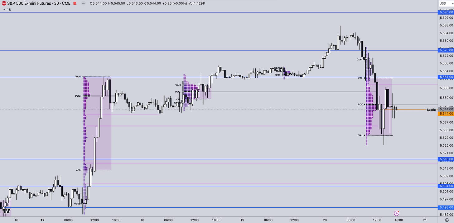 Any meaningful continuation will want to see acceptance back inside the upper distribution with a flip of the key resistance 5561 as support for upside follow up while on the downside, we still got plenty of room to rotate lower to fill these single prints with support at the highs of the previous range.