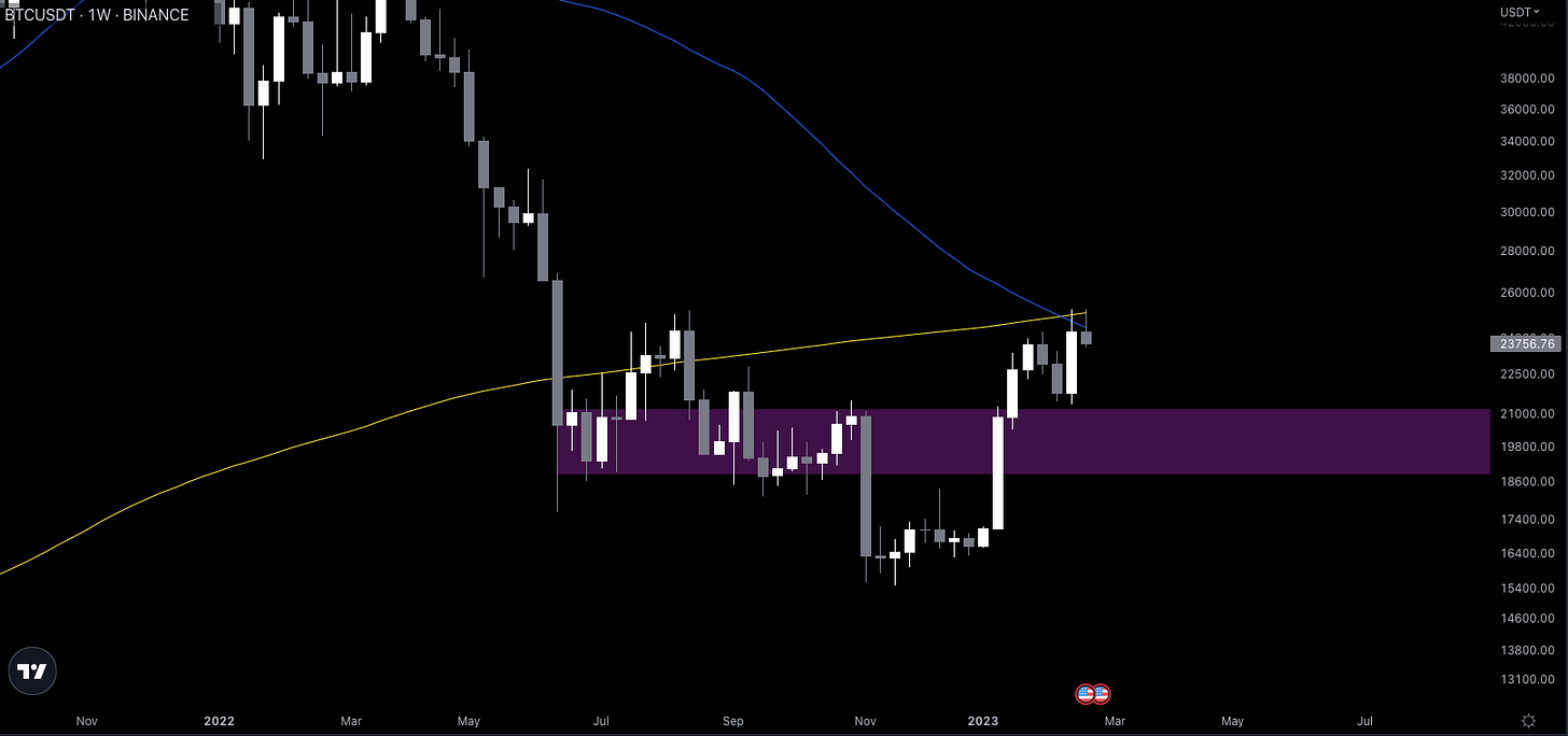 If we zoom out on the Weekly chart, things aren’t looking pretty for our precious crypto.