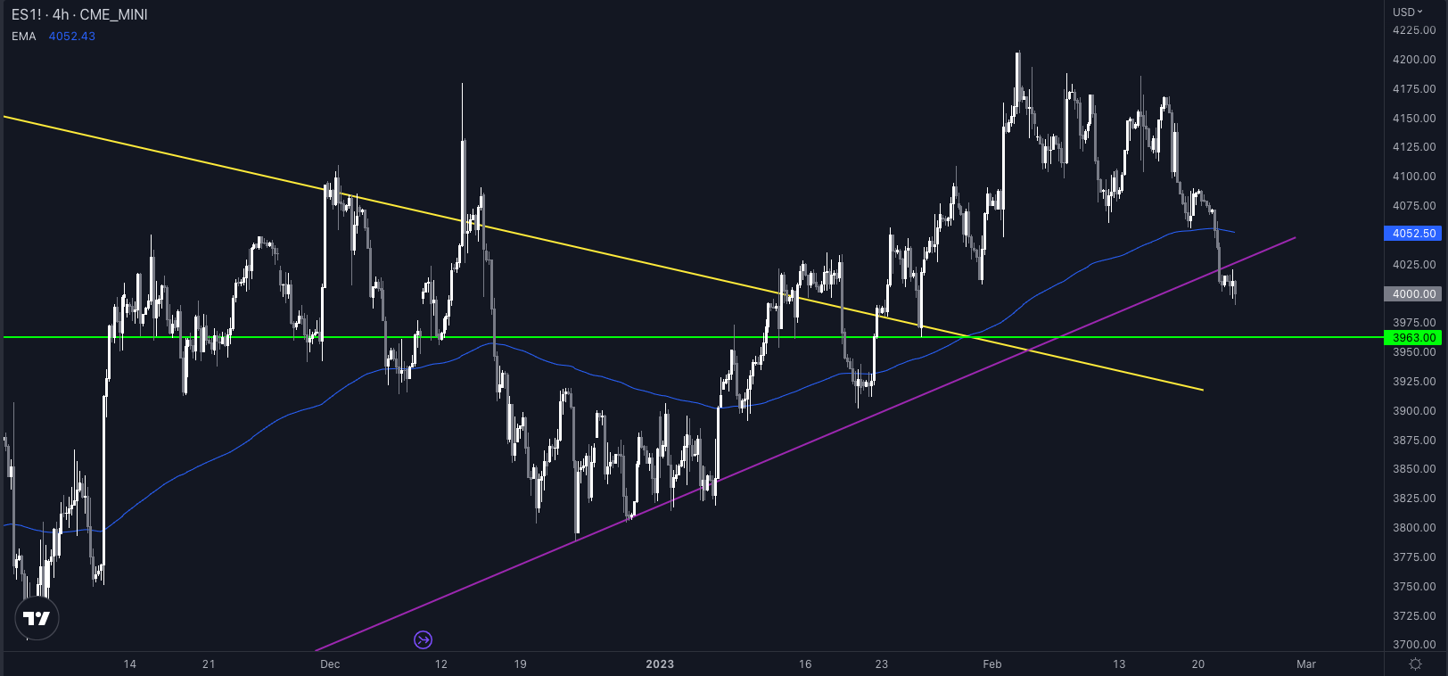 On the 4H ES1! chart (SP500 futures), we can see a clear break below that purple trend line and the 200EMA.