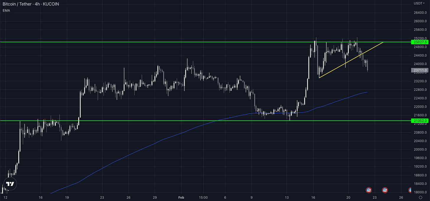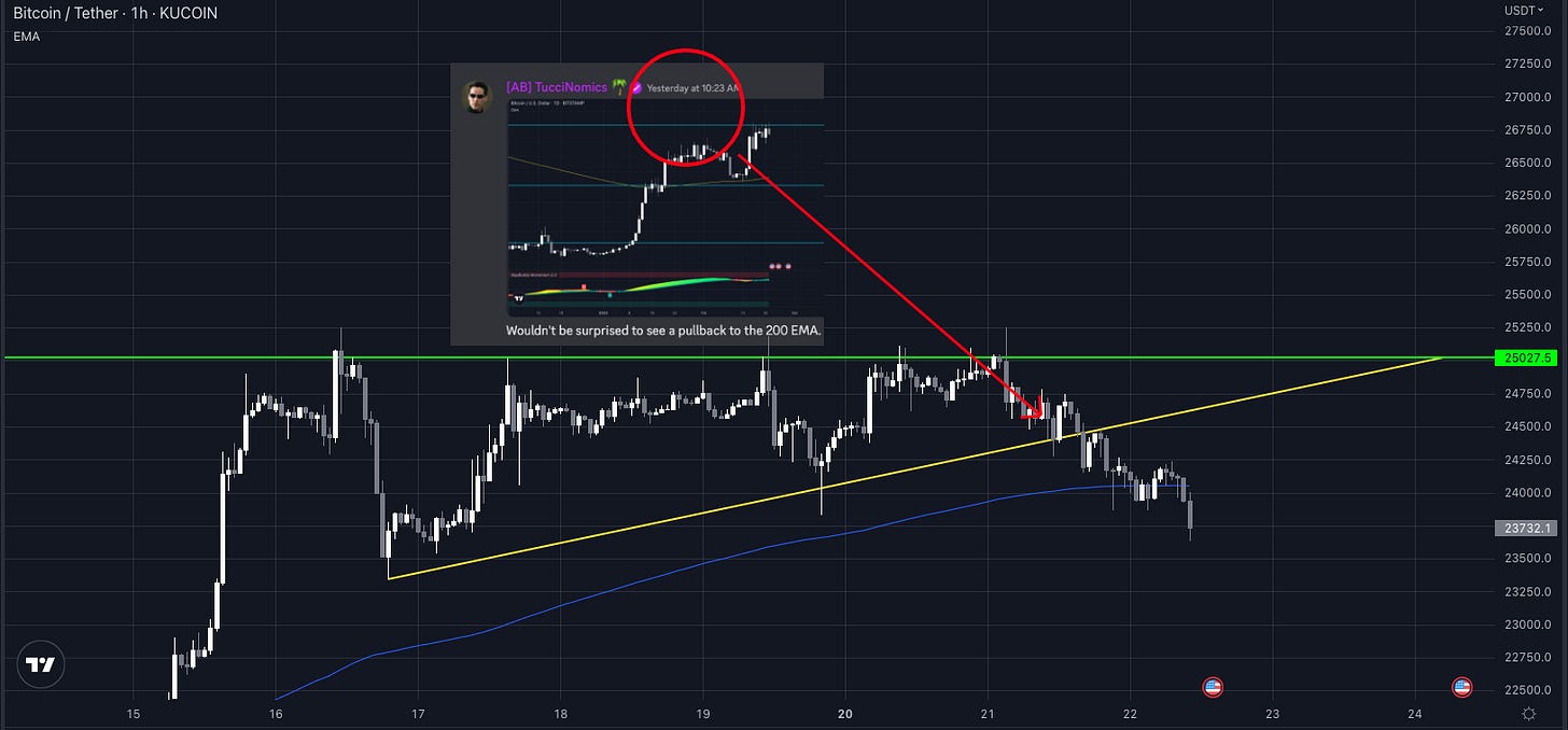 Looking at the Hourly chart, Bitcoin has now fallen below the 200 EMA and is dropping as we type this. Currently sitting at $23.7K.