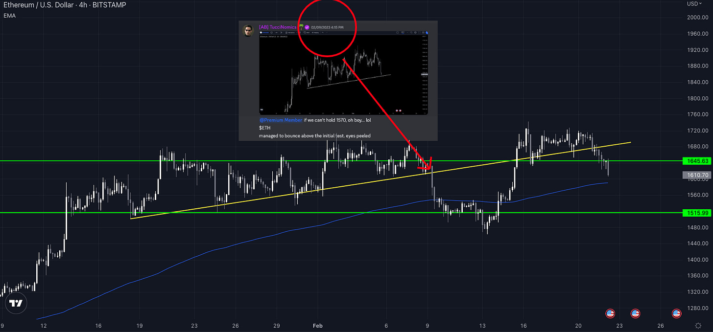 Taking a look at the 4H chart. First off, not to continue to toot our own horn here, but we called the previous leg down in ETH in our Discord on the 9th.