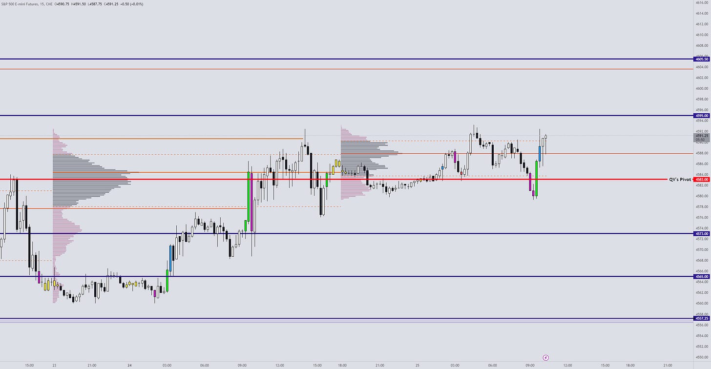 Today’s ON session started at the key pivot level of 4583 and made another attempt towards the 4593 resistance that we were watching.
