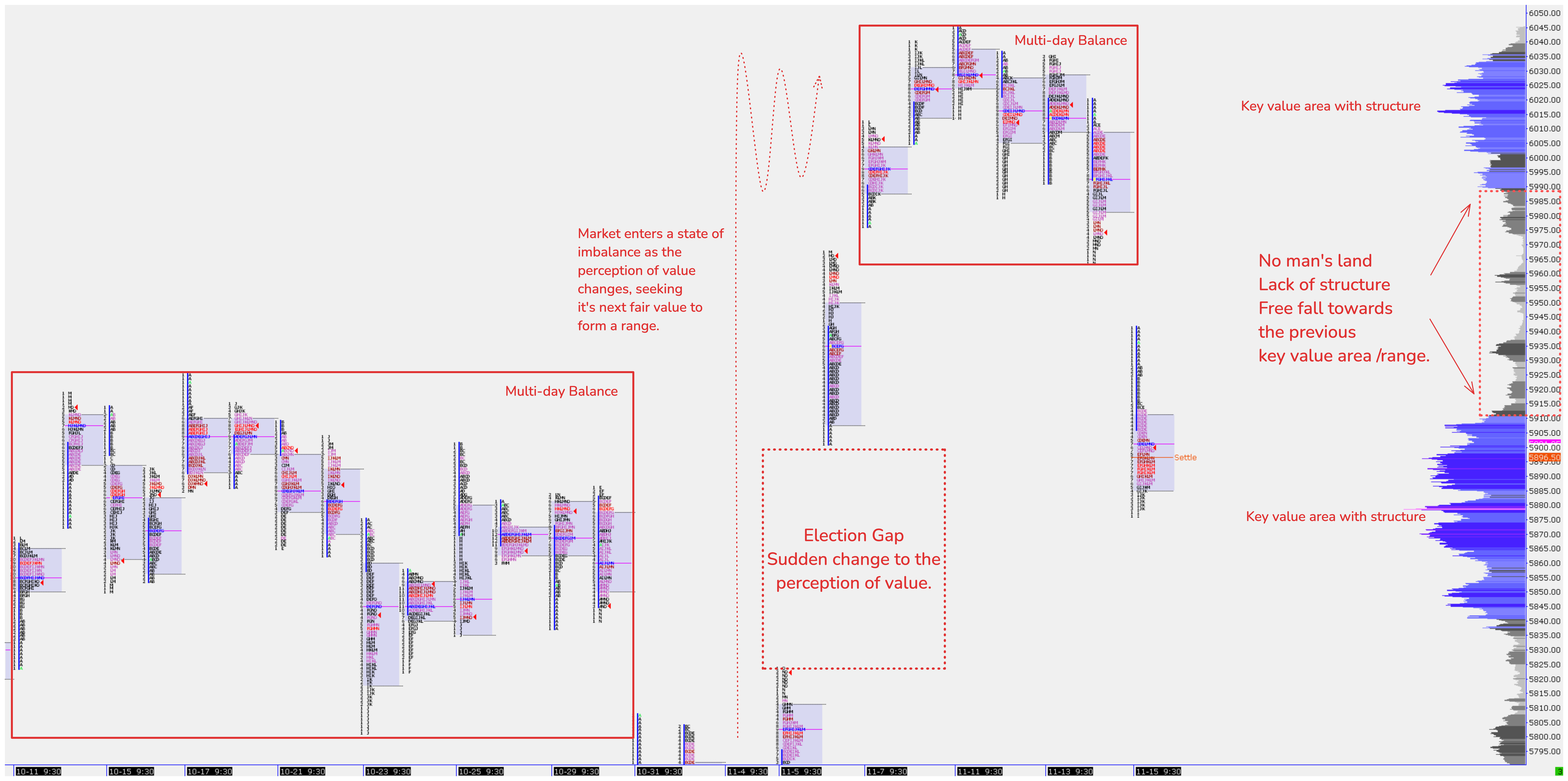 The market will always seek to trade at the fairest price, and once you enter a “void” of price, such as a gap or low-volume area, you will likely fall right through it and land on a previous “fair value”/ balance range.