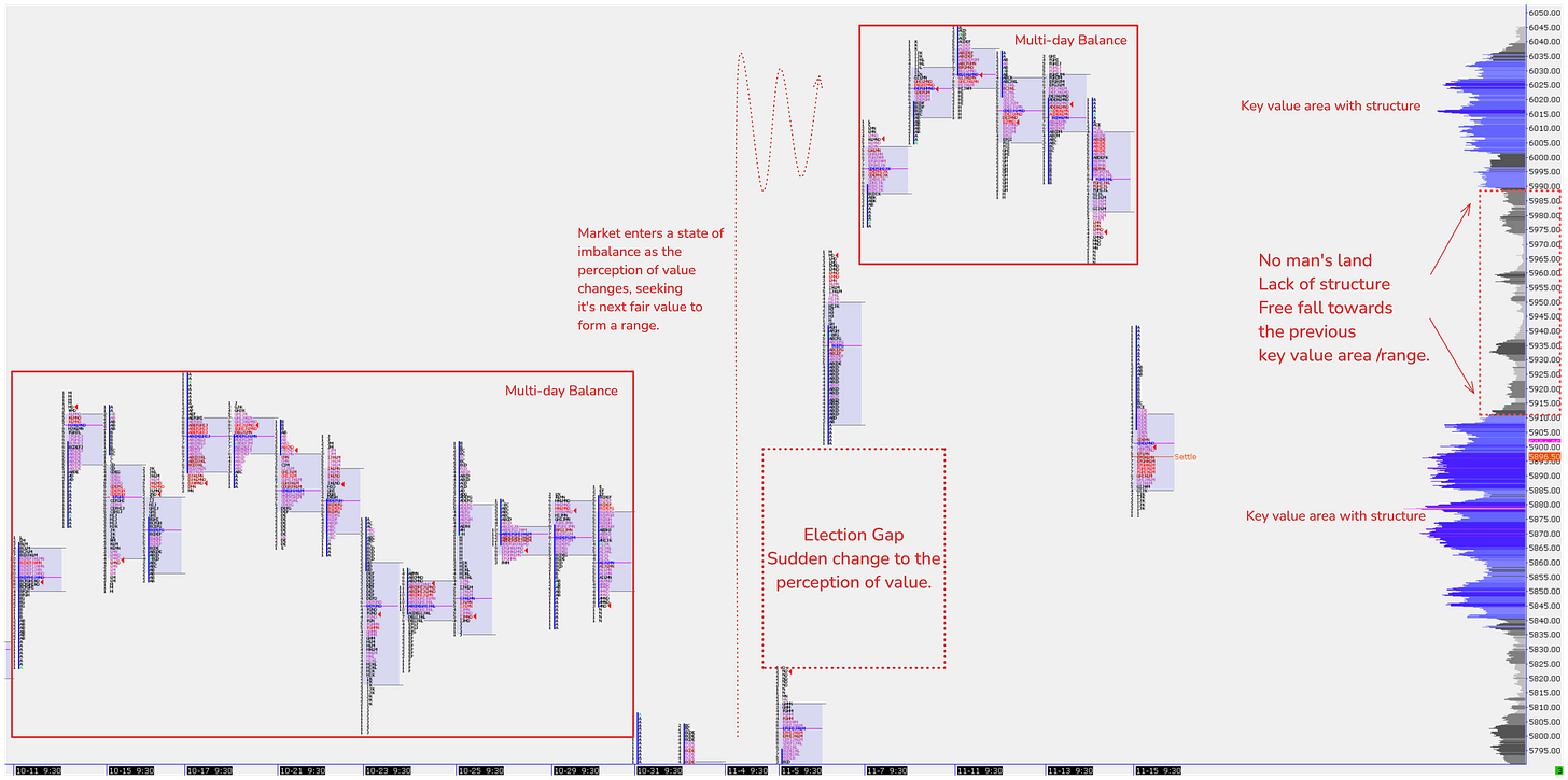 In our Thursday market brief, we highlighted the market’s two key value areas and a “no-man’s land” zone, which underscored an extreme low-volume area paired with a gap.