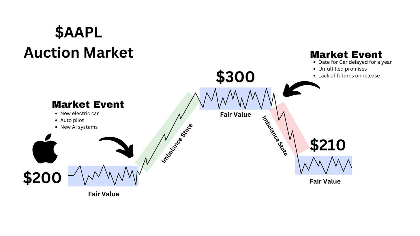 The excitement among investors is immediate. The news drives a wave of buying activity, and the market becomes imbalanced as demand surges. AAPL stock quickly rallies, rising to ~$300 as traders search for a new fair value that reflects the potential of Apple's expansion into the electric vehicle market.