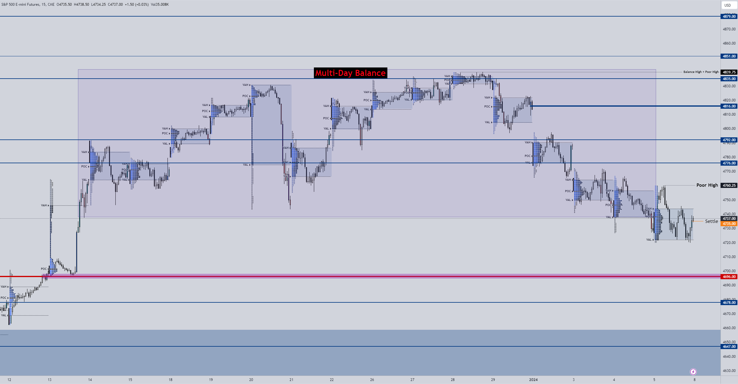The market is contained within the multi-day balance and meaningful change in the market will need to see a hold below our key pivot, the FOMC lows.