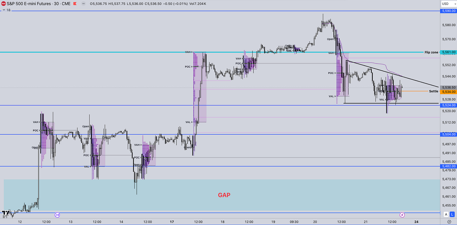 Acceptance on the range below will likely see this descending triangle play out. If we get a breach and hold below the 5520s on increasing volume, that’s a good signal of downside continuation.