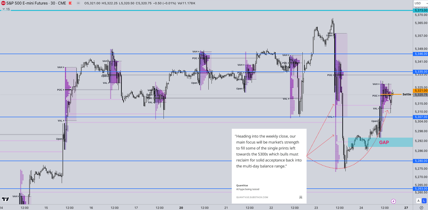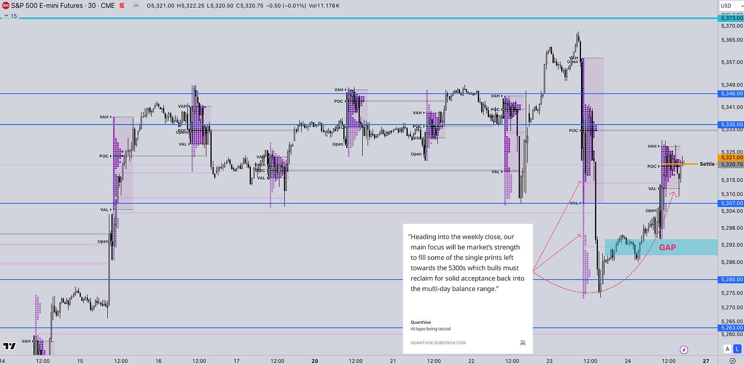 On our last Substack, our key outlook for the market was the ability for a re-test of the balance with the market filling the single prints left on Thursday’s session.