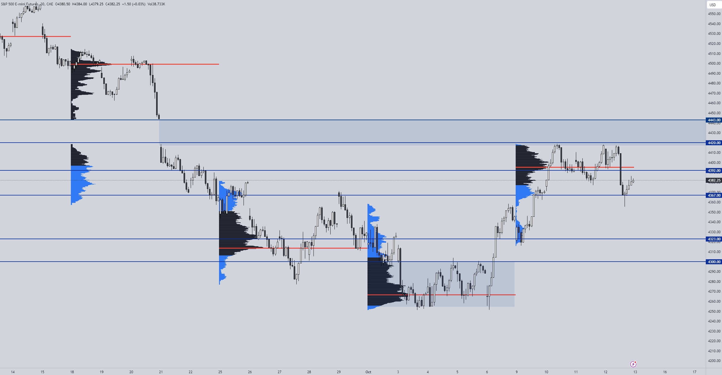 The key thing we are looking here is that the gap to the upside remains unfilled and bulls ability to close and bears want to retrace back bellow 4300 which has odds if acceptance is found bellow, for a complete roll-over to touch the other side of it.