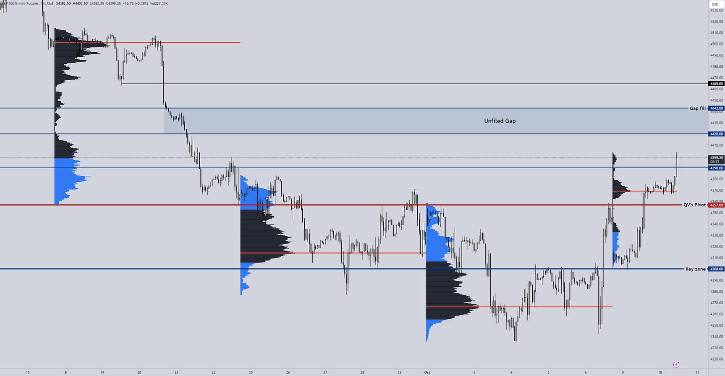 We are approaching the gap highlighted on the chart we are sharing here as well. If we find acceptance inside the gap, we can expect to trade until the other side of it. Bearish scenario would be to fall back down towards the pivot and especially anywhere close to the 4300.