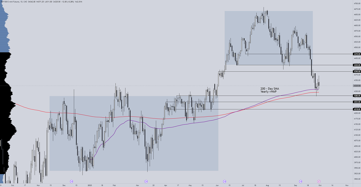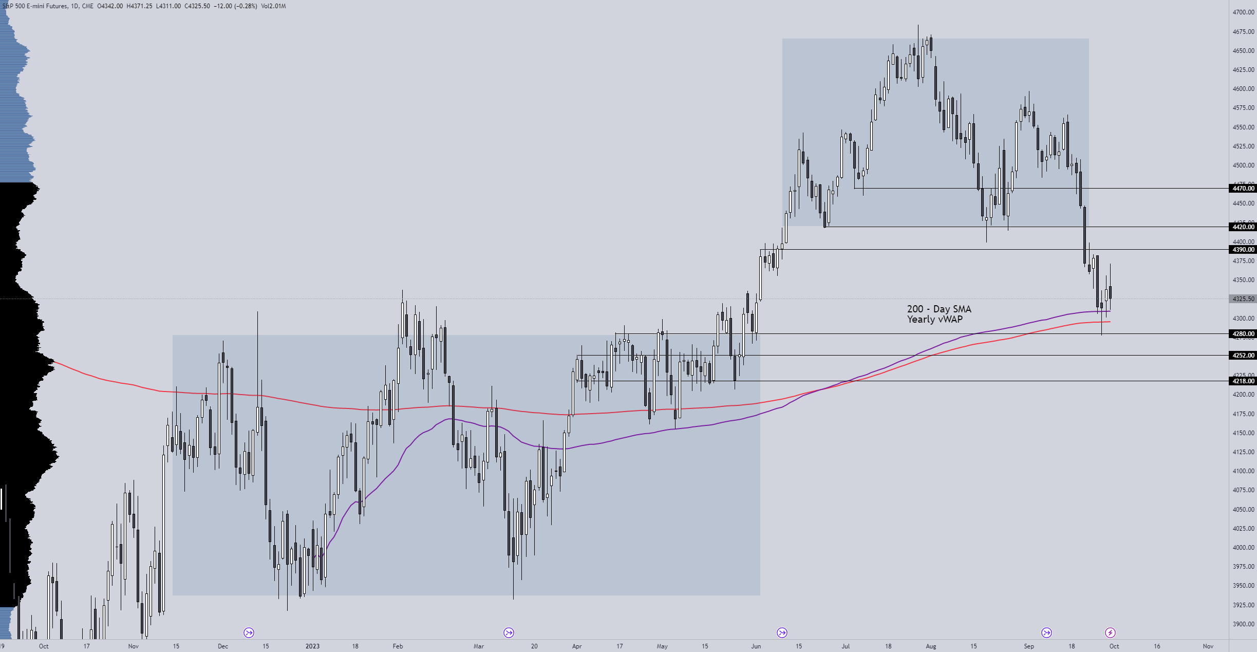 Right now, price is ranging between two key distribution areas after a bounce off of the 200-day SMA and the yearly vWAP and is not likely to continue spending much time in this area for an extended period of time.