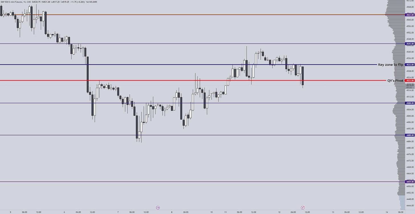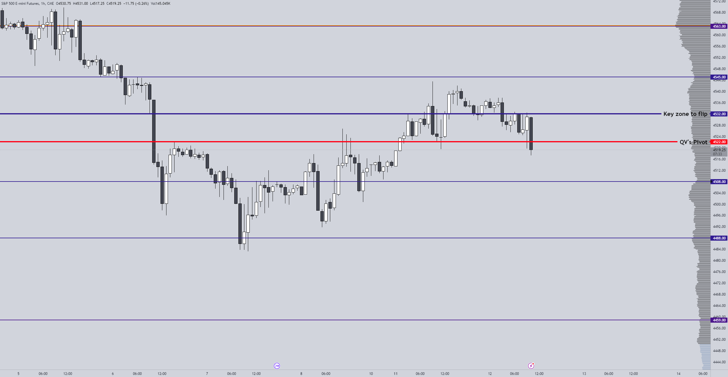Buyers aggressively pushed the prices towards 4543 which saw a rejection that led to downside continuation, around QV’s pivot at 4519.