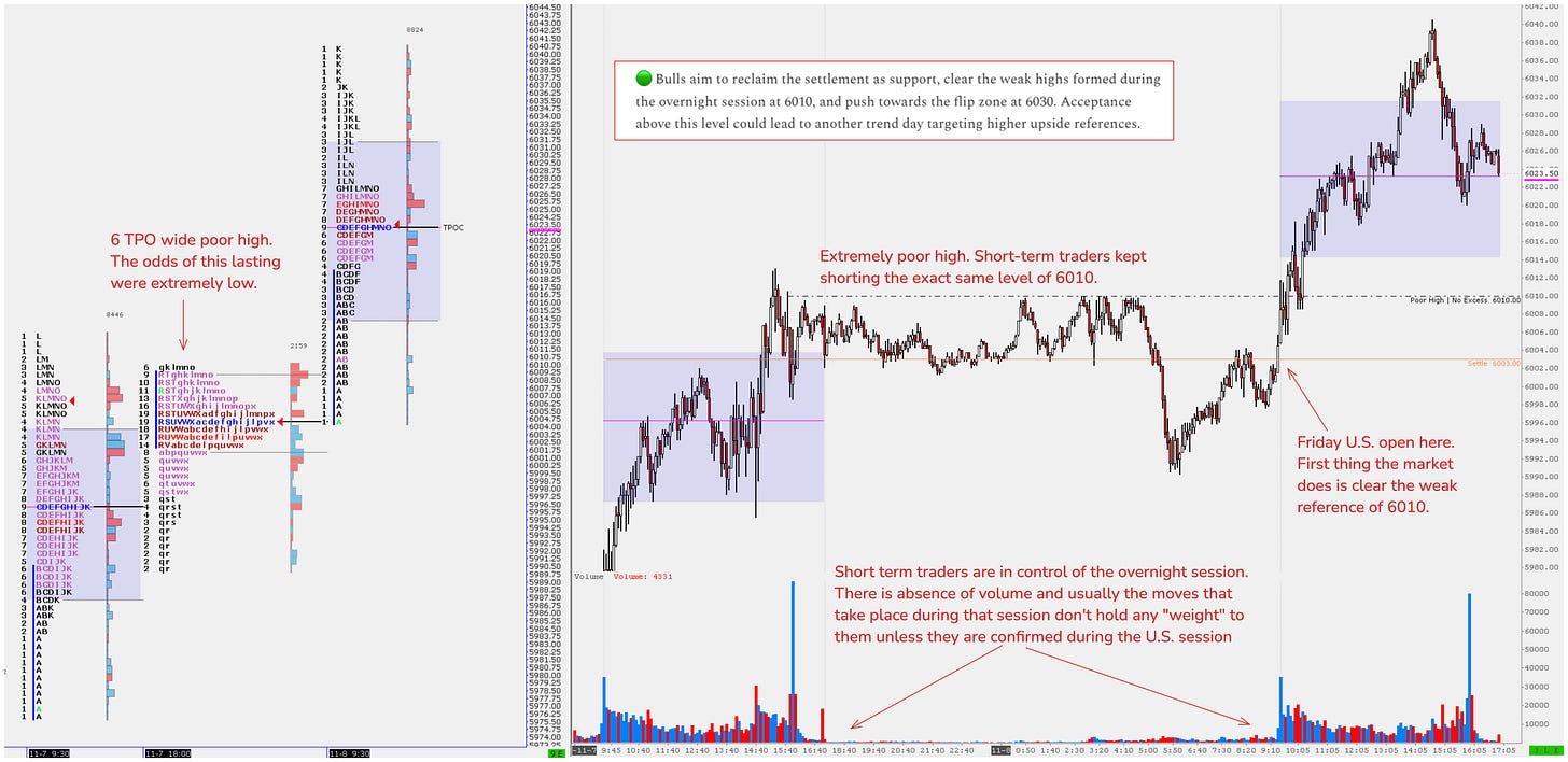 The chart above showcases the profile of Friday’s overnight session, featuring a 6 TPO-wide poor high at the exact level of 6010. Short-term traders repeatedly shorted the same level, resulting in no excess high.