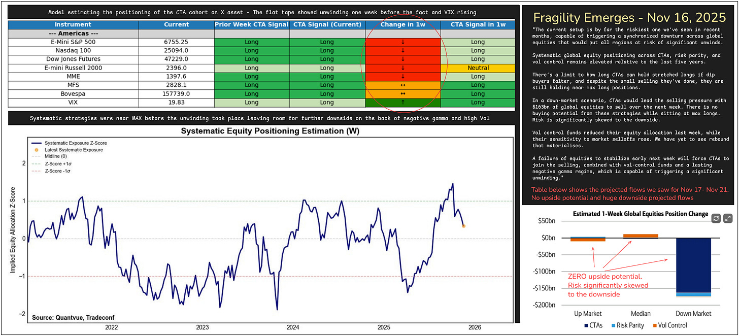 On Nov 16, 2025 we published our weekly report, warning our subscribers for the potential unwinding of systematic positioning at the start of that week.