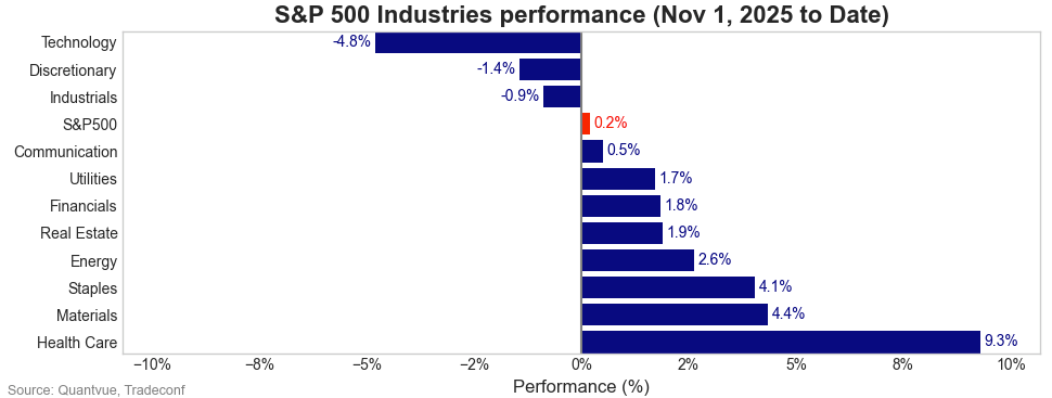 The image above adds more color to that view as we see the S&P 500 finishing November with a small gain and significant capital rotation from tech to safer pockets, something we’ve been stressing since the start of November.