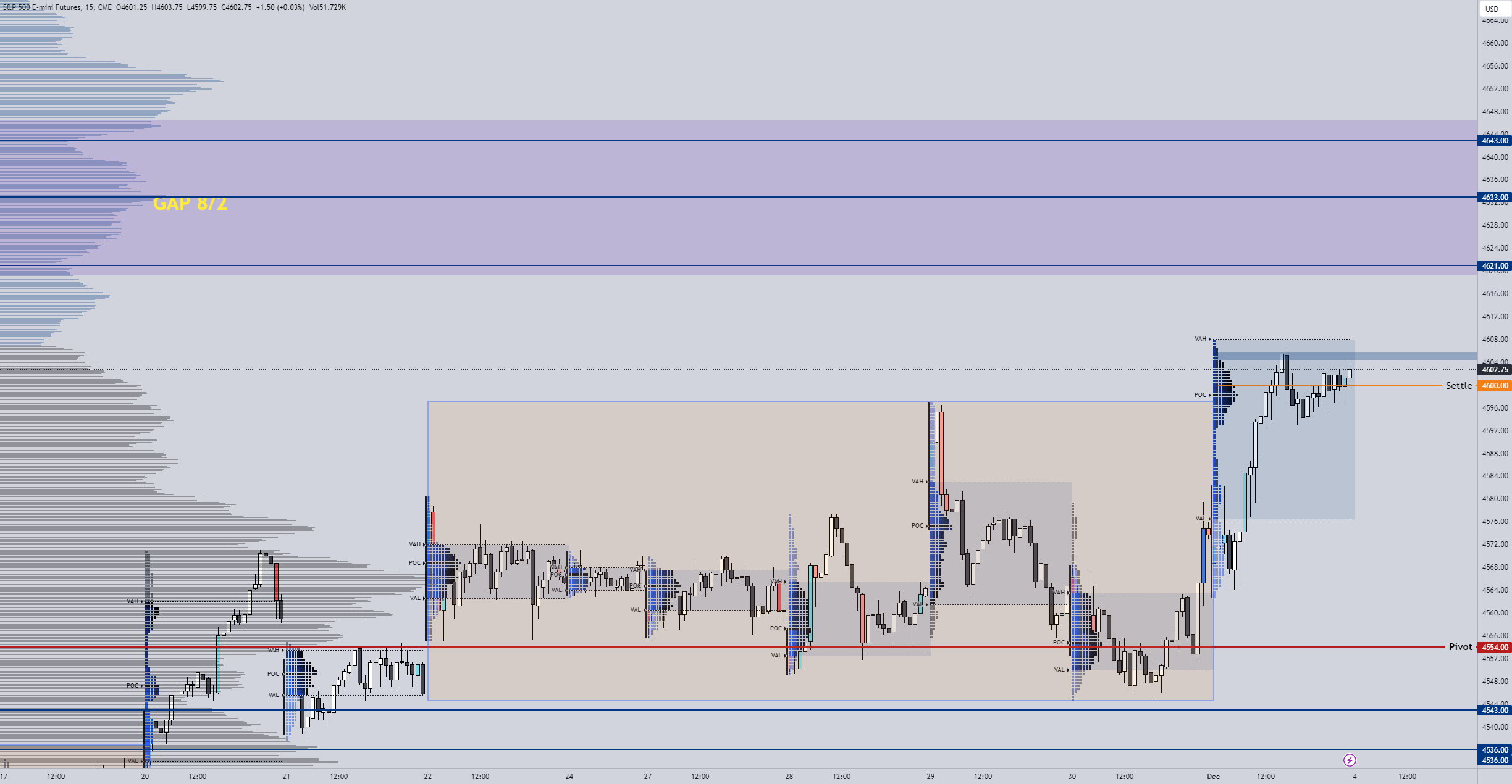 On the downside we can expect a re-test of the high volume node around the pivot with a possible rotation towards the other extreme of the balance area on Thursday’s lows.