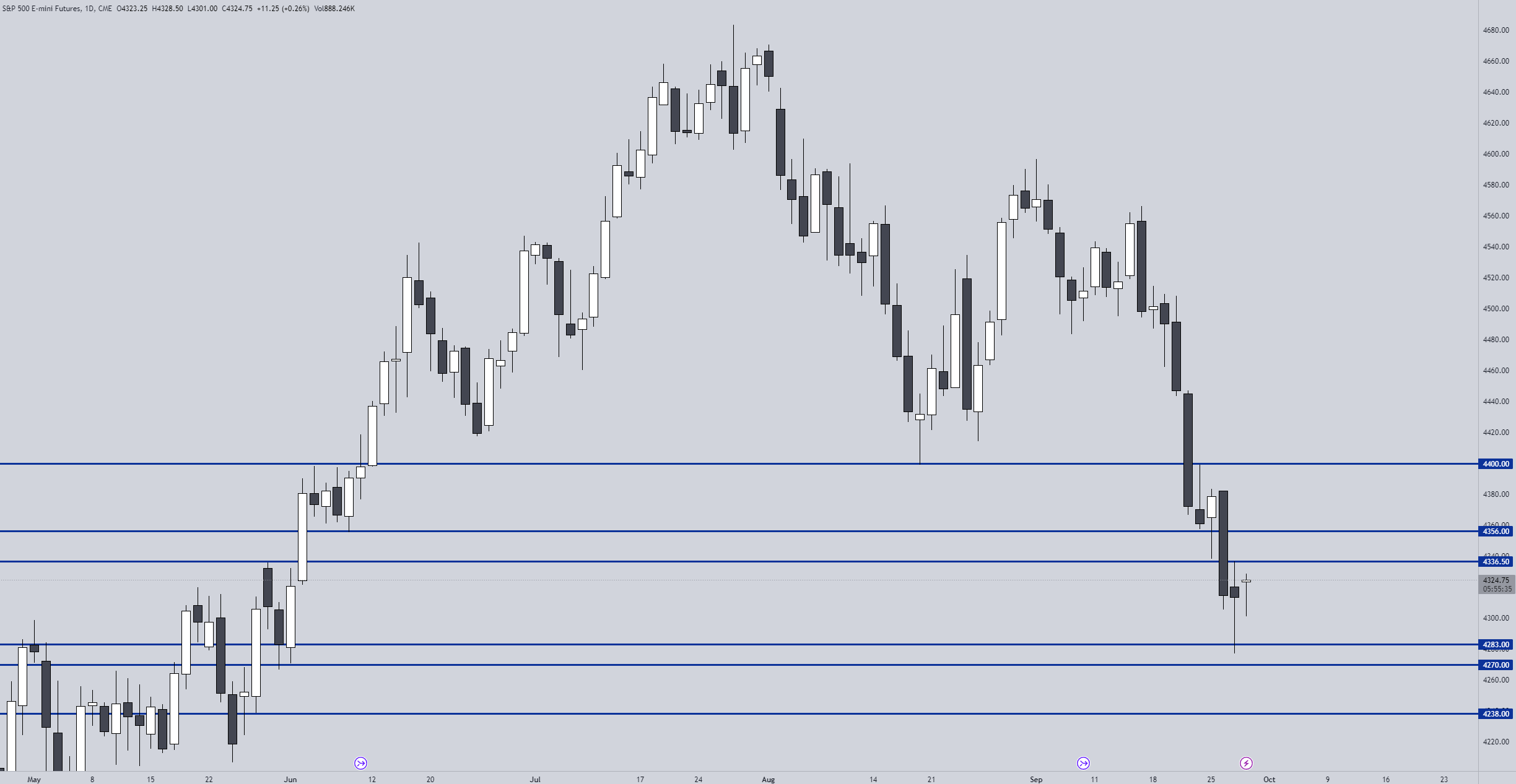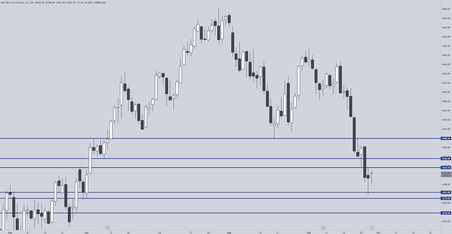 After no meaningful continuation to the upside, market started trending to the downside for the most of the session seeing brief relief bounces at the levels we posted towards 4301/4291.