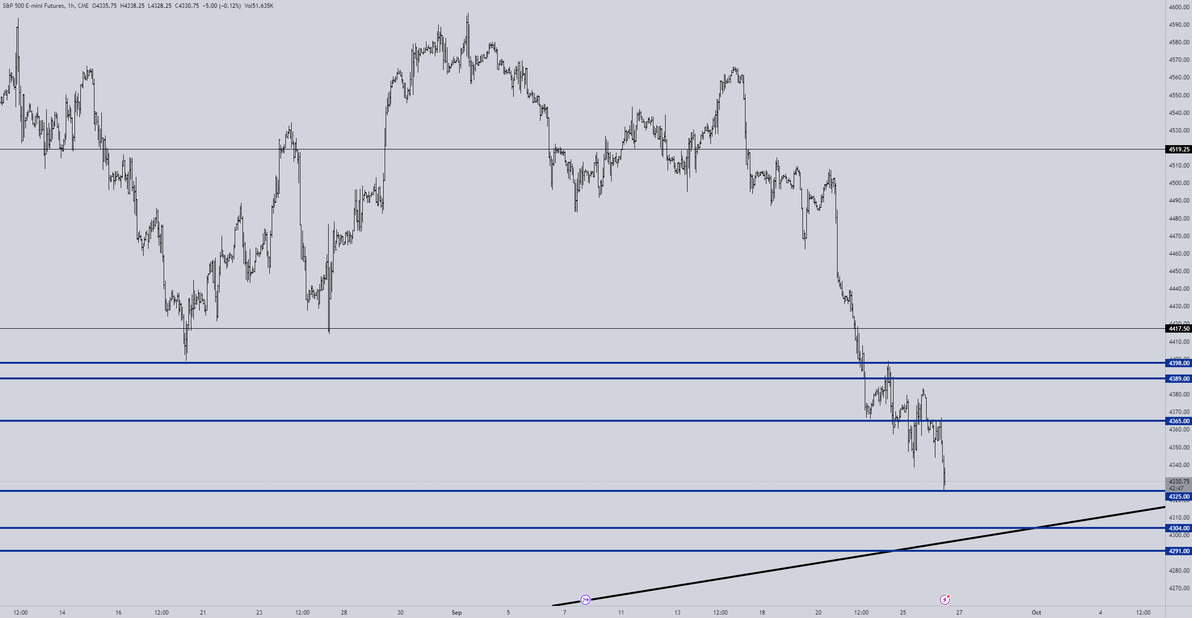A bounce at the previous weekly low happened after a failed acceptance back bellow the range, triggering a short-covering rally of +0.60% that lead straight to the top zone of the range we were looking at 4384, completing the bullish scenario we’ve posted on the ON session.