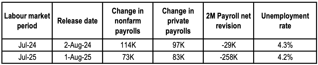 US macro resilience was challenged as the July jobs report showed softness, with sharp downward revisions. This data challenges Chair Powell’s “wait-and-see” approach. The muted unemployment rate impact suggests weak labour demand and supply due to slowing growth in foreign-born labour.