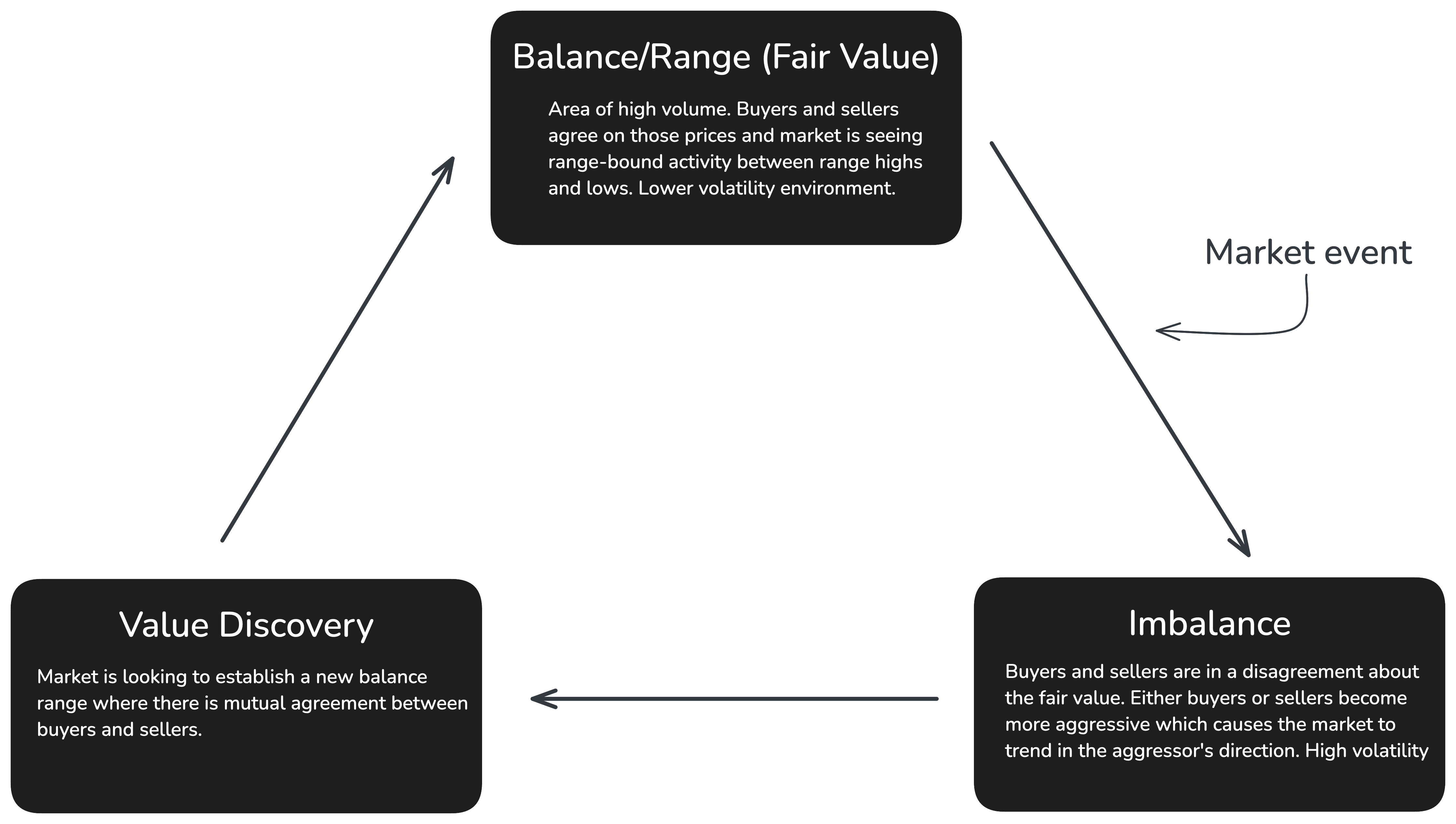 Market imbalances arise from events that prompt either buyers or sellers to take a more aggressive role. Prices situated above or below the fair value price characterised by high volume are deemed "unfair" prices.