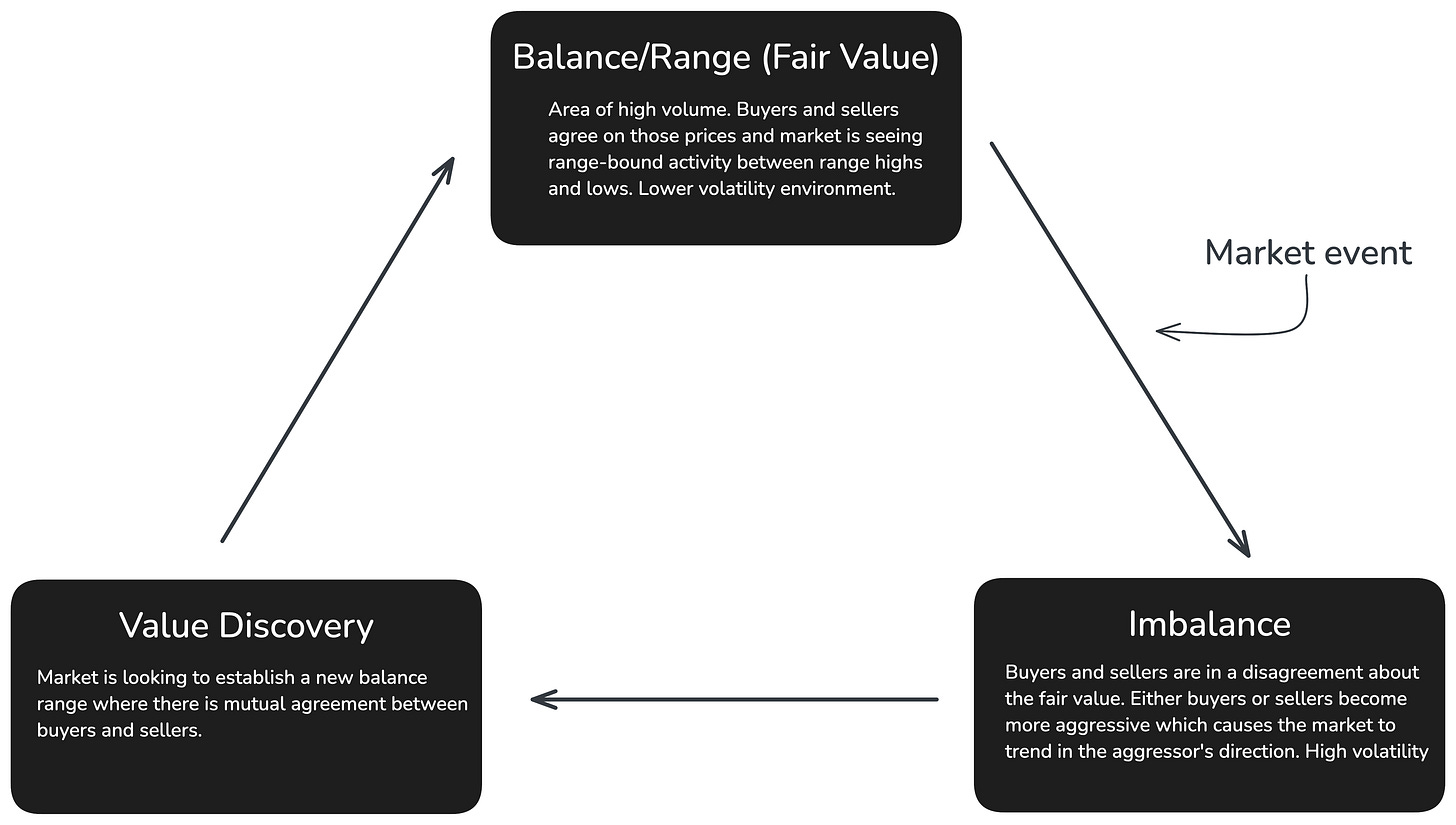 Fair Value represents the price range where trading is most active among market participants. The equilibrium between buyer and seller aggression leads to trading within a range with increased volume that is known as a state of balance.
