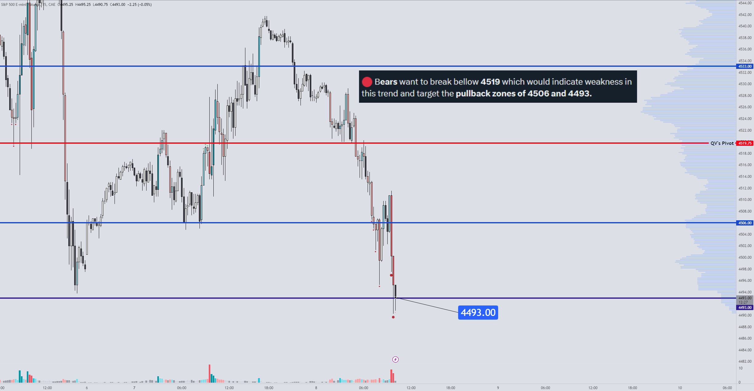 Which lead to the breakdown of the 4519 pivot which was targeting the first downside targets of 4506/4493 zones as we’ve mentioned on the bearish scenario in the ON session post here.