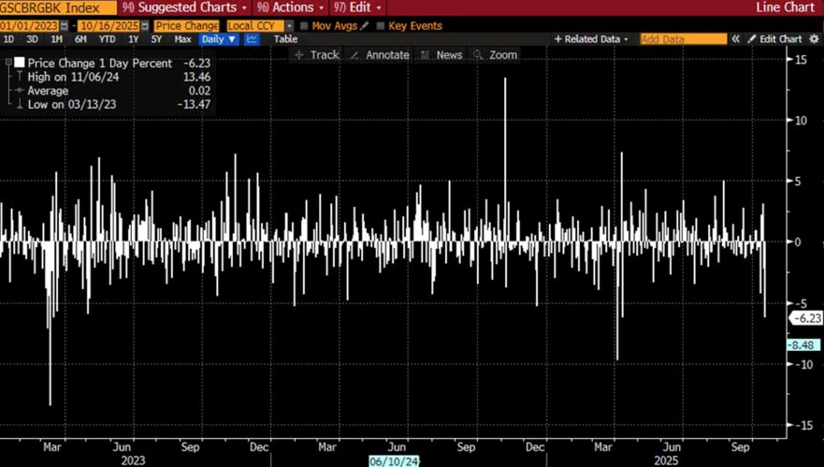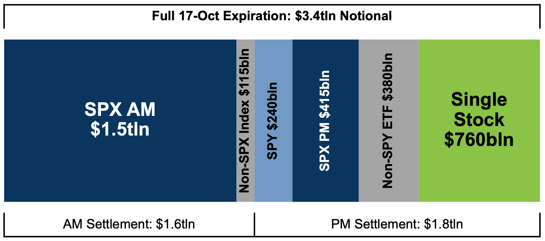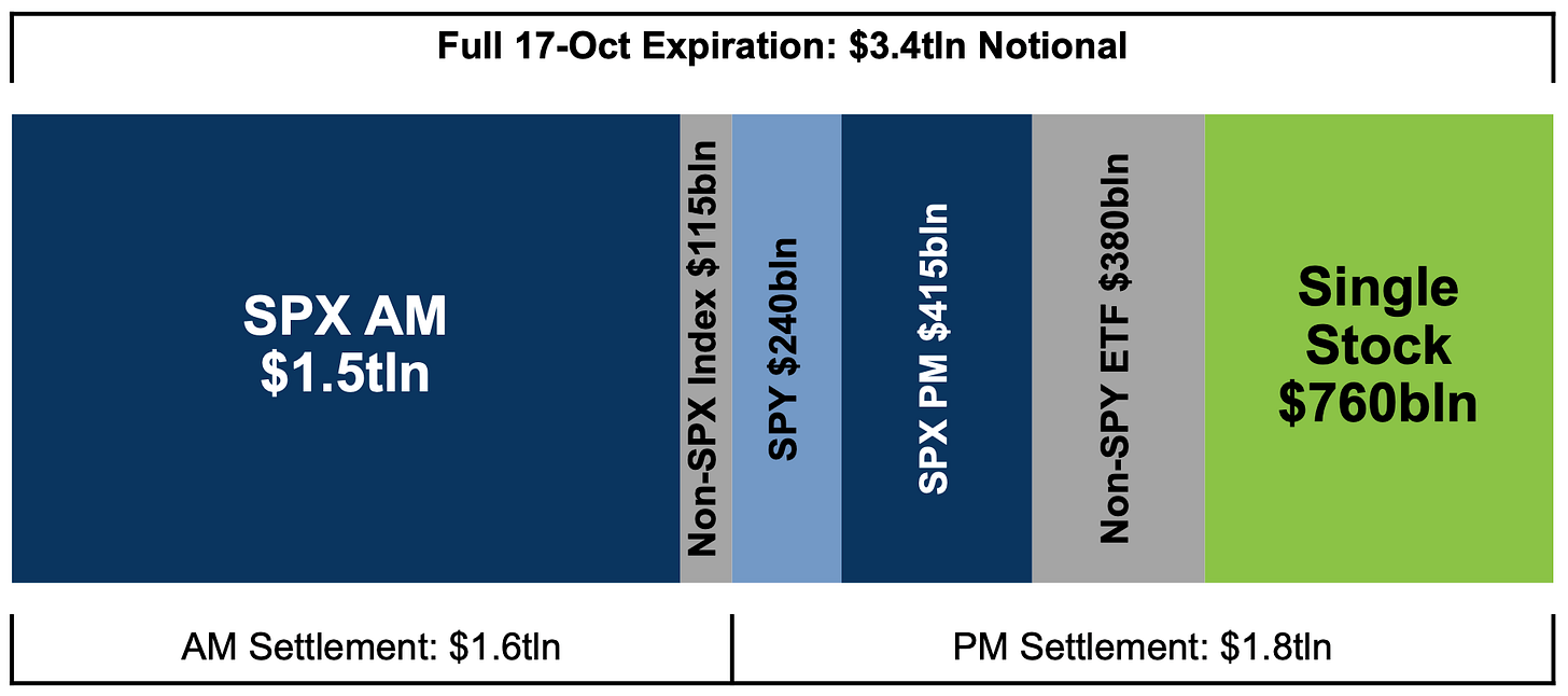Over $3.4 trillion of notional options exposure will expire today, including $1.9 trillion of SPX options and $760 billion notional of single stock options. The notional open interest for this expiration is the largest recorded for any October.