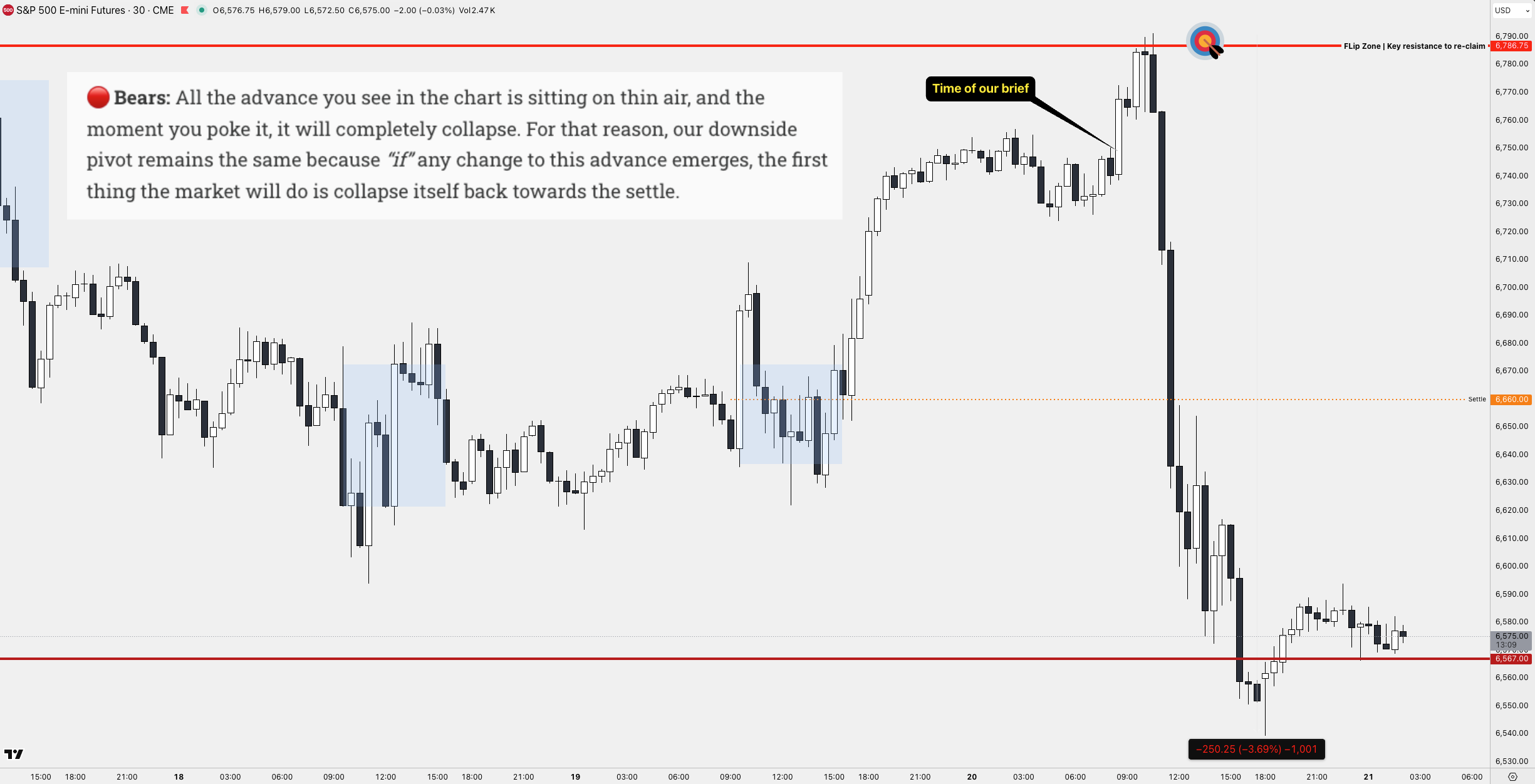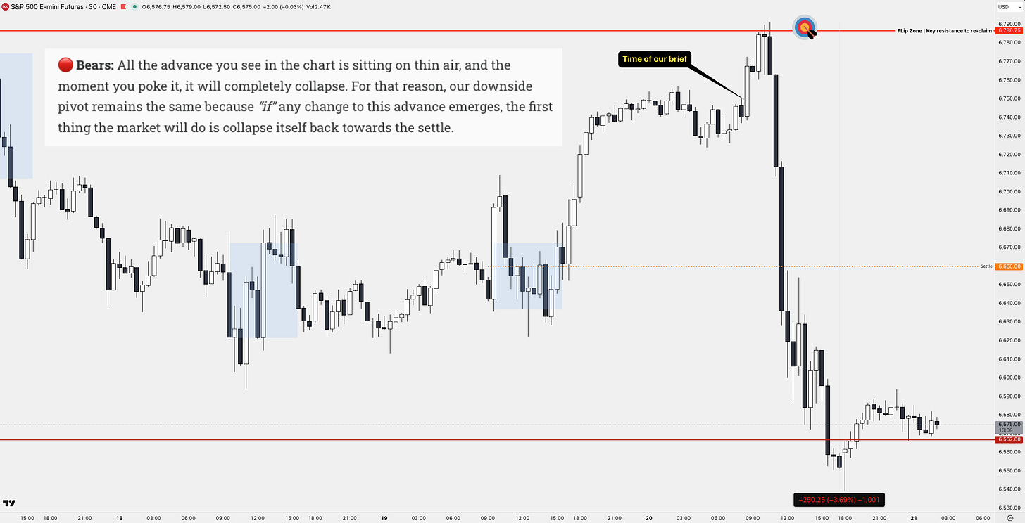 🎯 On $ES, we identified 6786 as the first key resistance. That level ended up marking the absolute top before the market collapsed more than 250 points. The follow-through aligned perfectly with the scenario we laid out, essentially playing out textbook to our forecast.