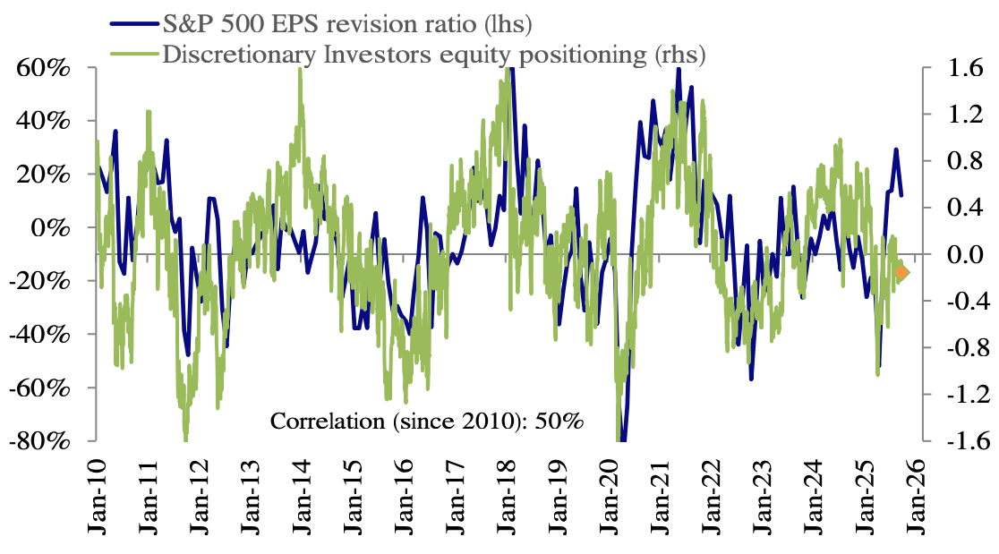 Discretionary investors have continued to hug neutral, even as the typical drivers of their positioning, such as earnings and macro growth, suggest their exposure should be substantially higher.