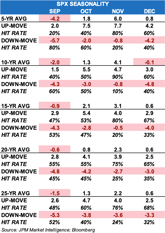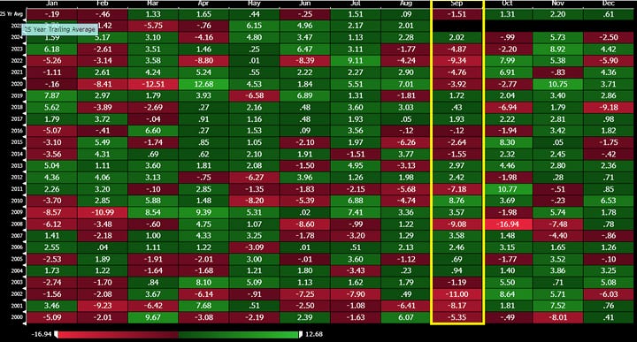 September is by far the worst seasonal month of the year (25 yr lookback), but this year might prove to be a bit trickier with Fed heading into cut(ting) regime.