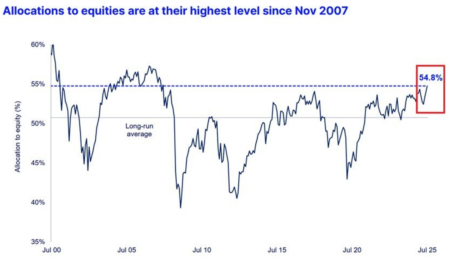 Meanwhile Institutional investors’ equity allocation rose to 54.8% in July, the highest since the early months of the 2008 Financial Crisis.
