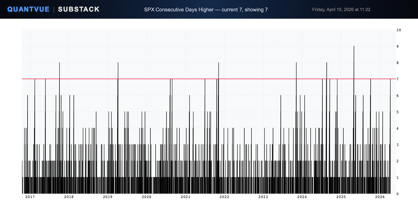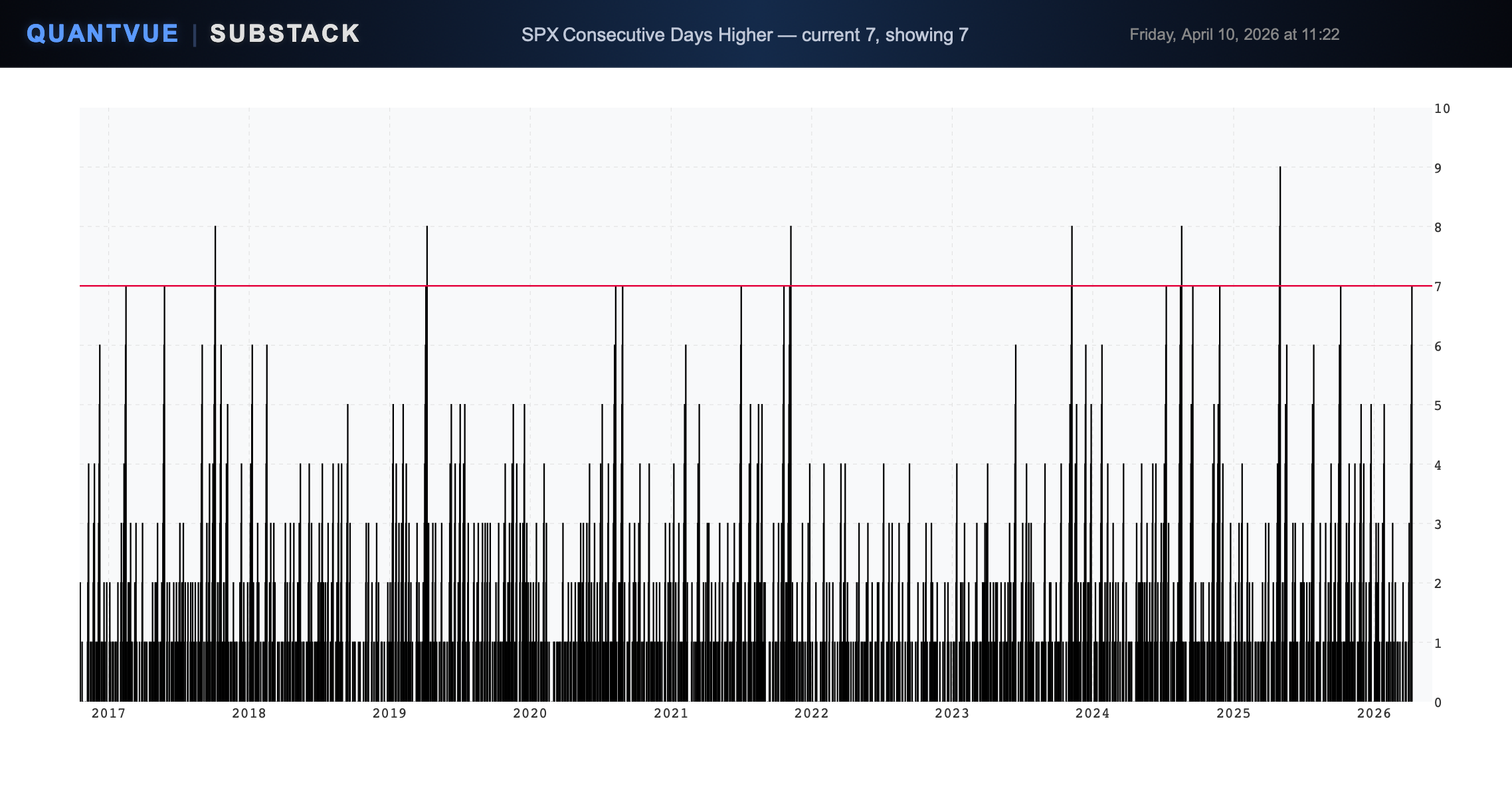 The S&P 500 has now closed higher for seven consecutive sessions.
