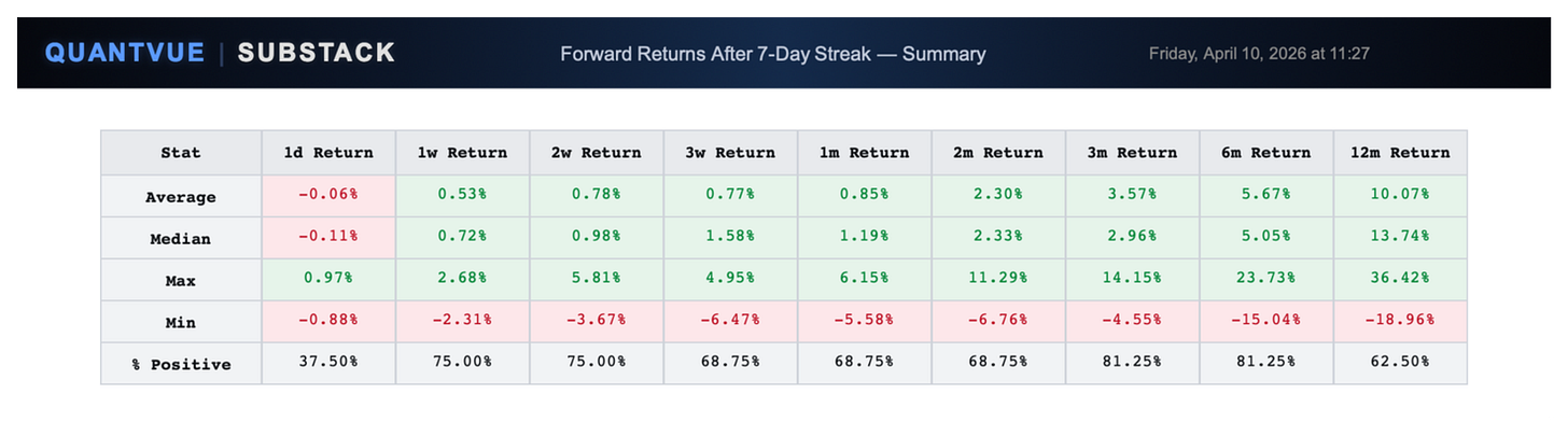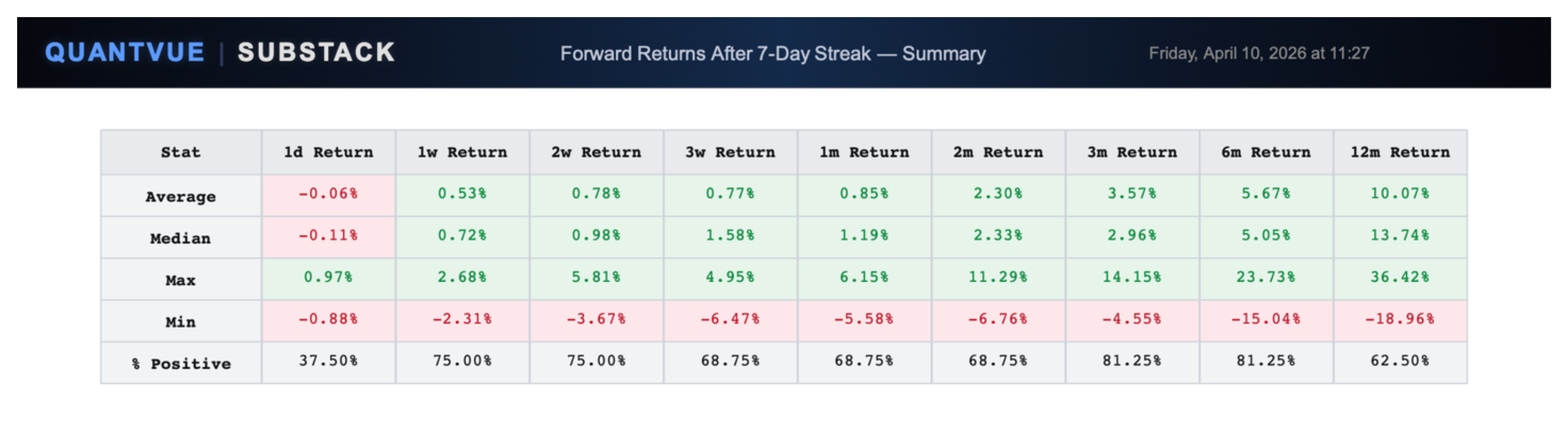 Examining comparable streaks over the past decade, near-term forward returns were modestly positive on average. The picture improves considerably at longer horizons. At the six-month mark, the S&P was higher 81.25% of the time, with an average return of 5.67% and a median of 5.05%.