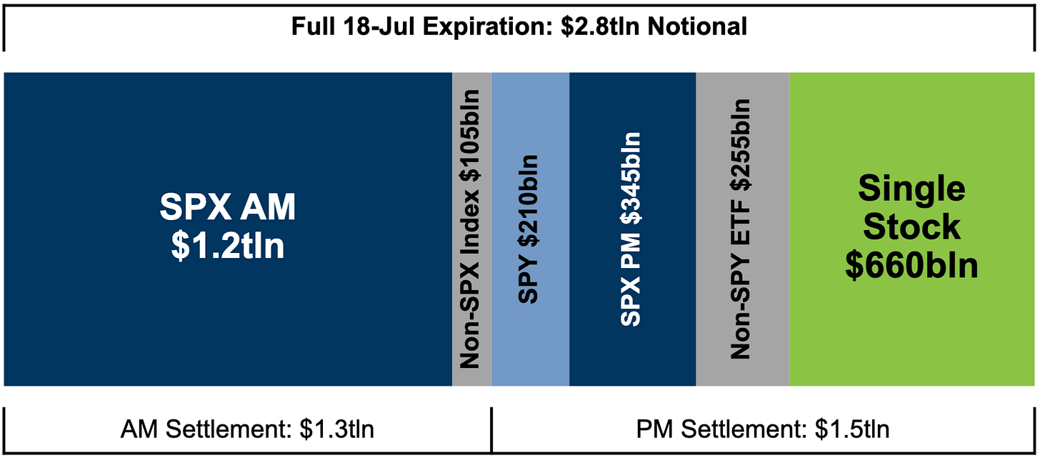 With recent quad-witching opex events still fresh in mind, today’s $2.8 trillion option expiration — made up of $1.5 trillion in SPX options and around $660 billion in single stock options — is shaping up to be fairly uneventful.