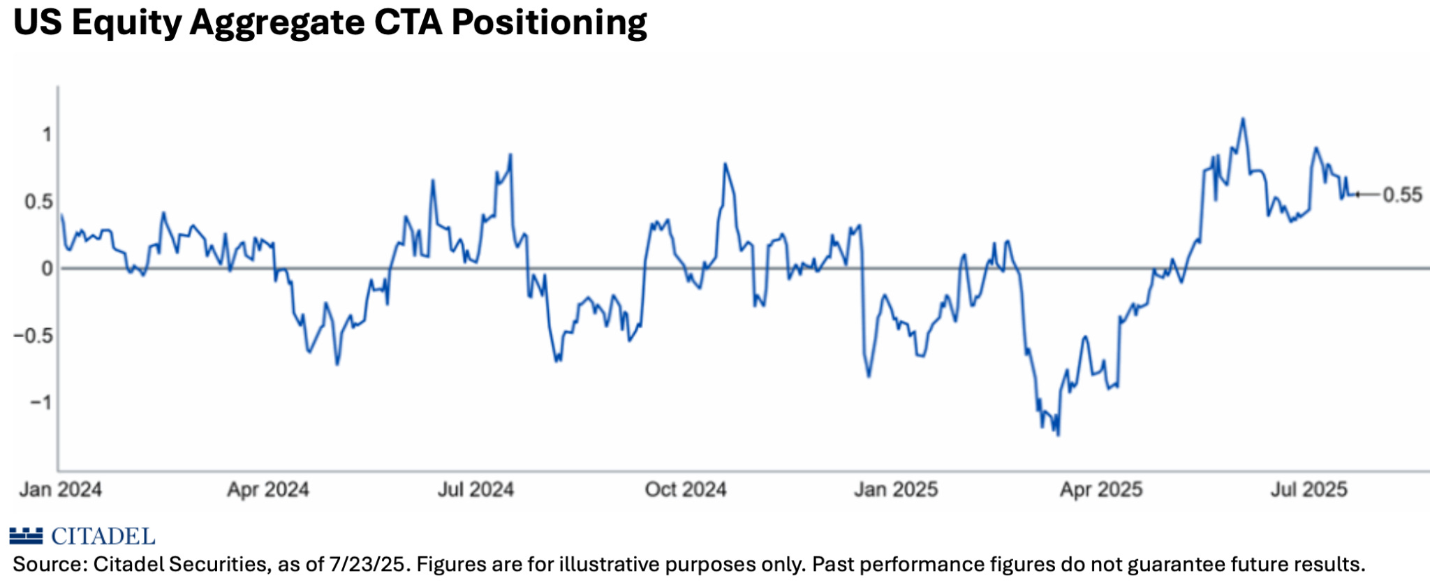 Commodity Trading Advisors (CTA) strategies, which are momentum and trend followers, have plenty of room to add equity exposure. Positioning from this cohort is not stretched and has capacity to add exposure over the next month.