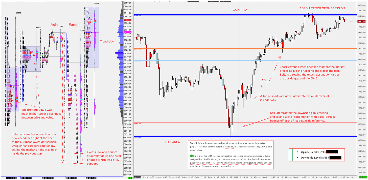 The overnight session is controlled by the weakest of hands, who are easily shaken out of their positions the moment a trade goes against them. They often become the “fuel” for a short-covering trend day. How do you cover a short? You have to buy.