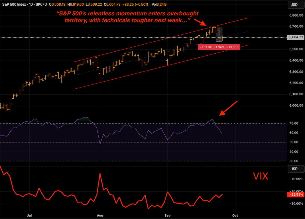 On Sunday, we warned of mounting risks in the market as the S&P 500 was entering overbought territory and facing tougher technicals on the underlying. Since Monday, we’re now down ~2%.