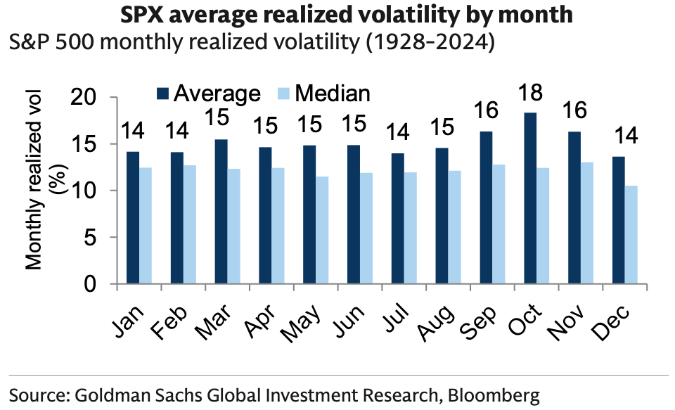 Volatility tends to be about 25% higher in October. Since 1928, October SPX realized volatility has averaged 18 vol vs. 15 vol for other months. Elevated October volatility is visible across each major index and sector over the past 30 years.