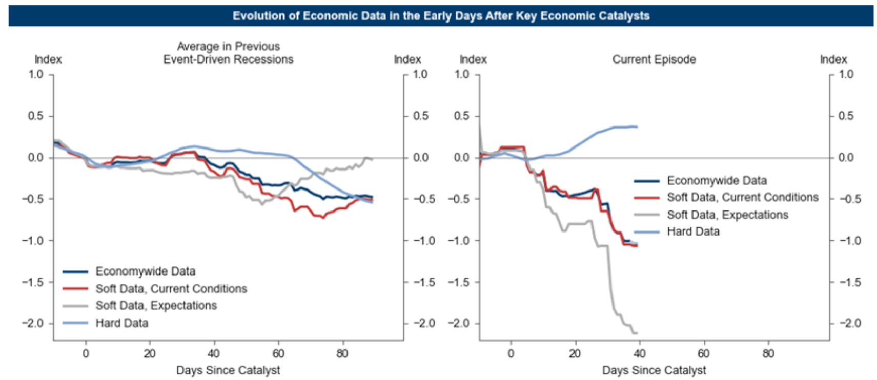 Economically, the data so far mirror a sharper version of typical event-driven slowdowns: surveys have declined quickly—especially outlook expectations—while hard data, which usually take about three months to show real-time weakness, haven’t softened yet.
