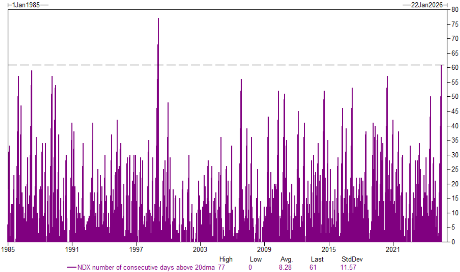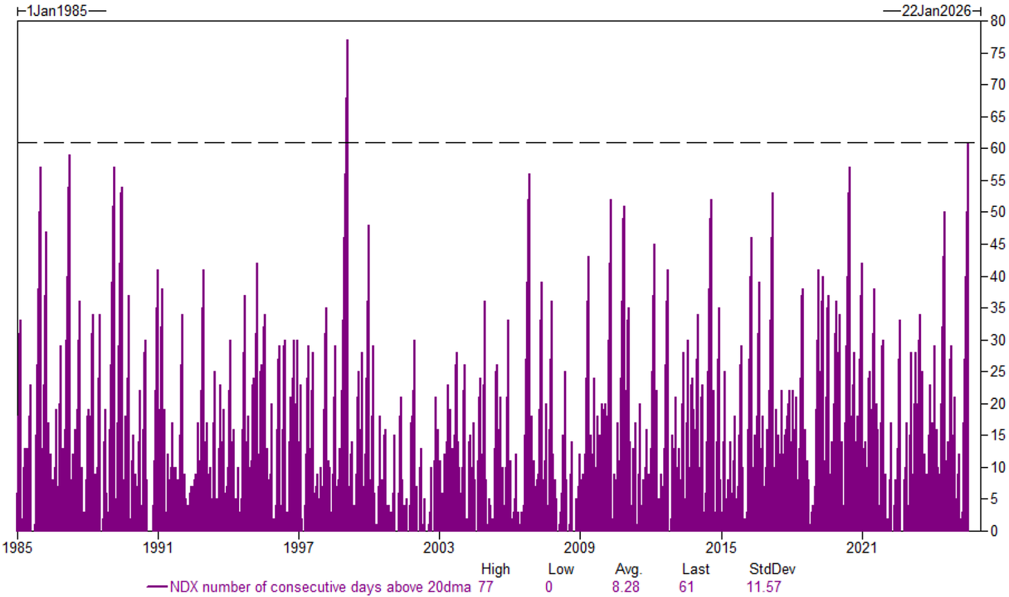 NDX notched its 62 consecutive day above the 20-dma. The last time this happened was January 1999 (1-year later, the index was up 77%).