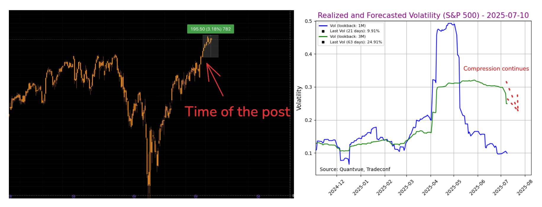 The image above, along with the context, was shared last month during our brief on 6/26 [HERE]. Since the time of that post, the market is up around ~200 points, and vol projection continued to follow the compression path, which allowed the market to go higher.